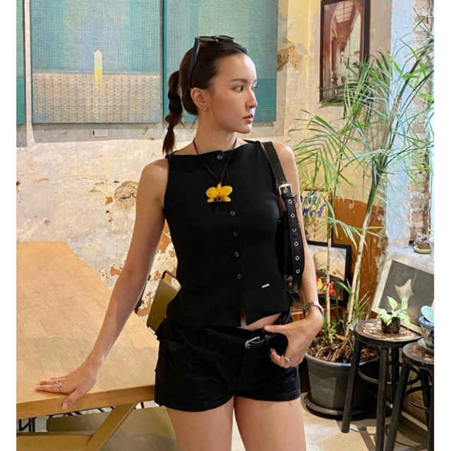 เสื้อแขนกุด คอปาด แต่งกระดุม ผ้าcottonทอร่อง Annona Top