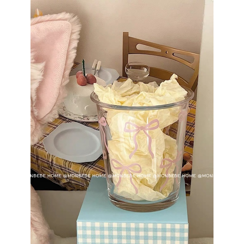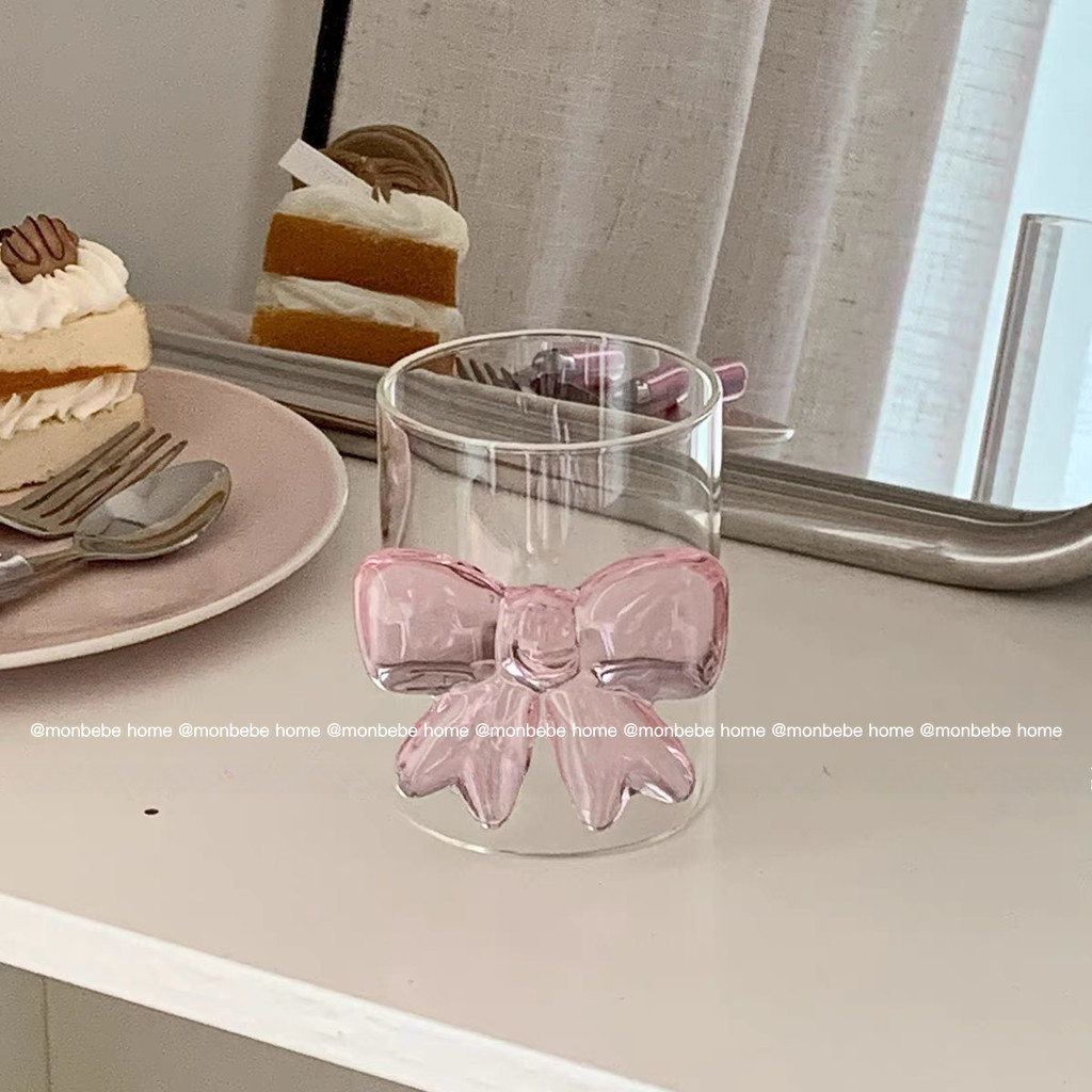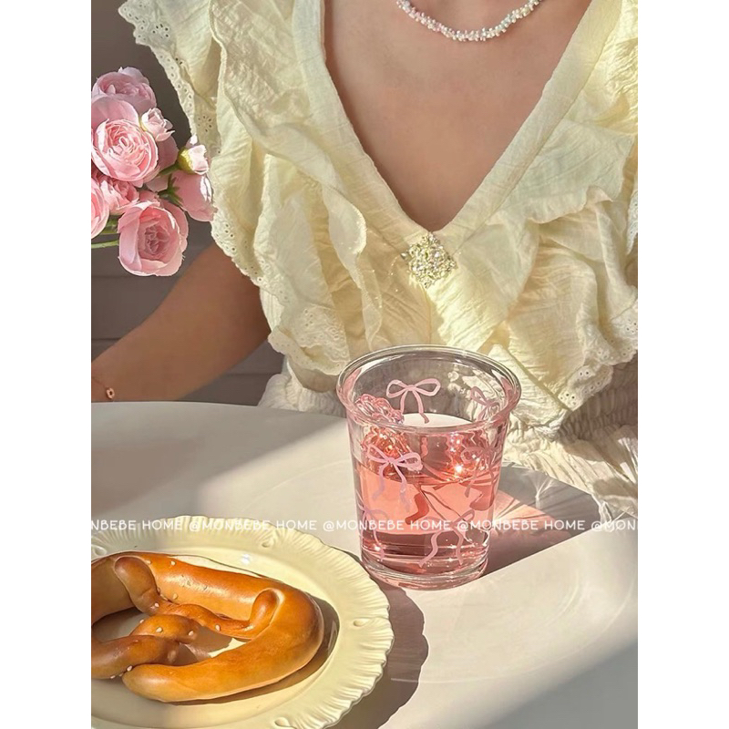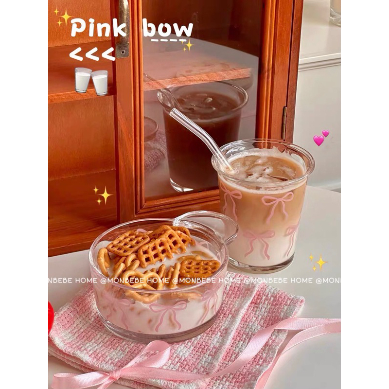 แก้ว แก้วน้ำ แก้วกาแฟ ลายโบว์สีชมพู สำหรับร้านกาแฟ พร้อมส่ง!!!