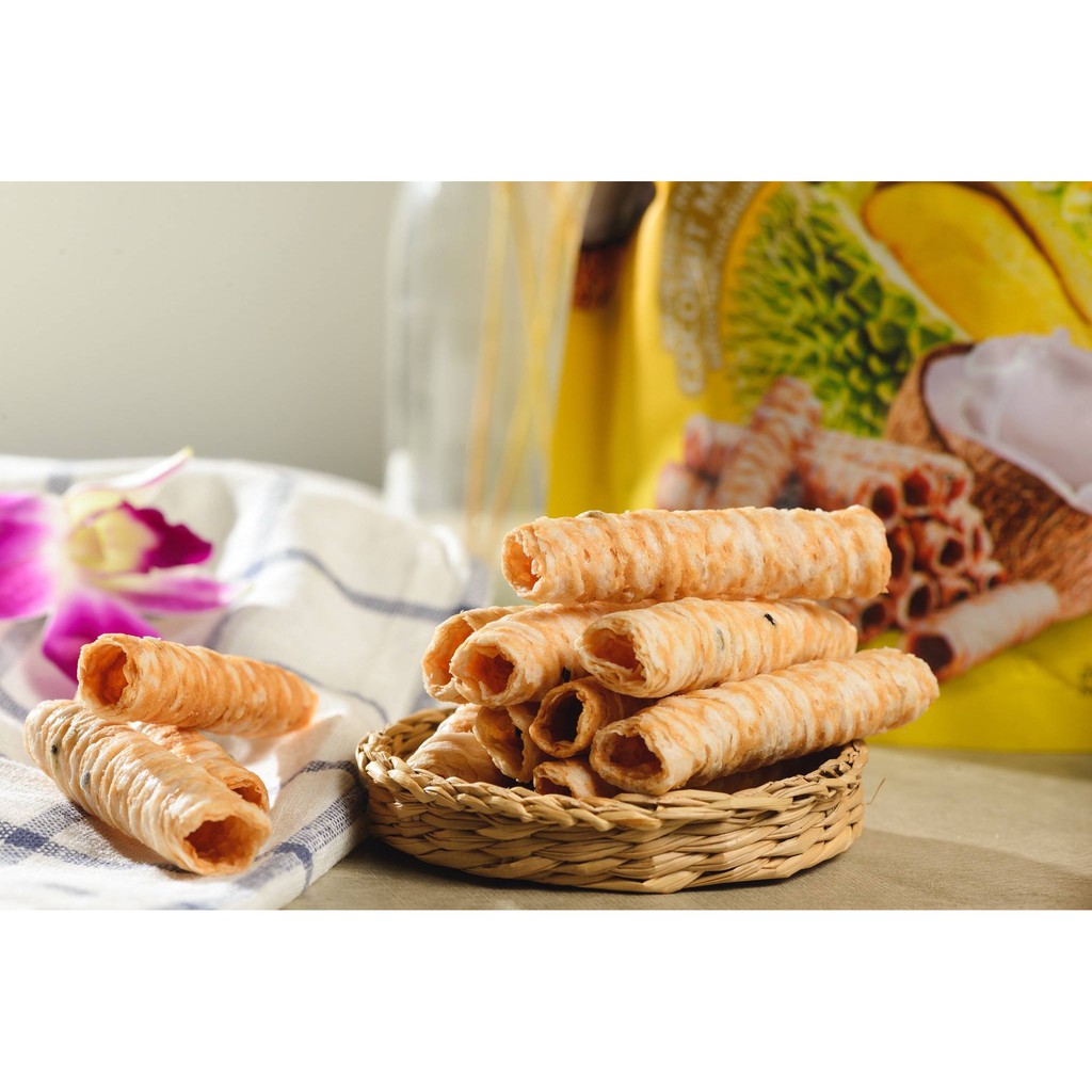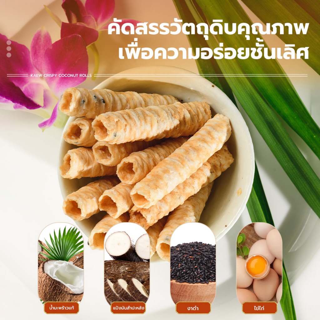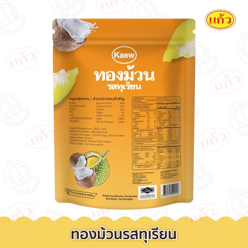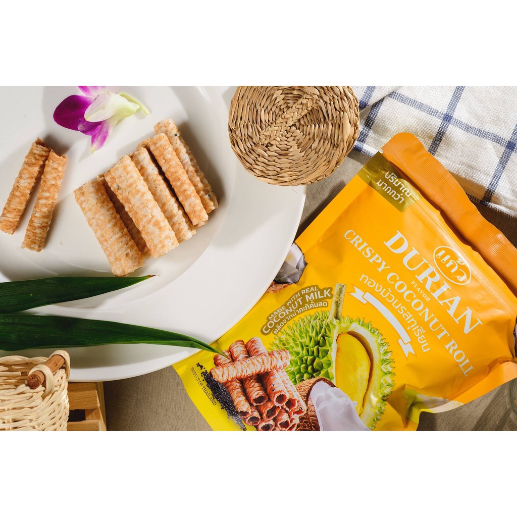 แก้ว ทองม้วนกะทิแท้ รสทุเรียน ขนาด 80 กรัม ( ของฝาก กาญจนบุรี ขนมไทย ขนมกรุบกรอบ ขนมกินเล่น )