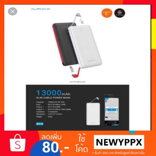 แบตสำรอง Alpha-X รุ่น E13 Power Bank แบตสำรอง 13000 mAh ชาร์จได้รวดเร็ว ปลอดภัยมาตรฐาน (มอก.) ( สีดำ,สีขาว )
