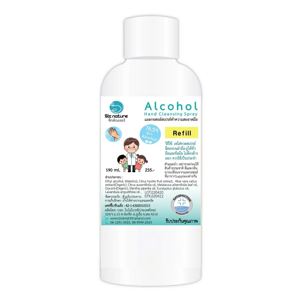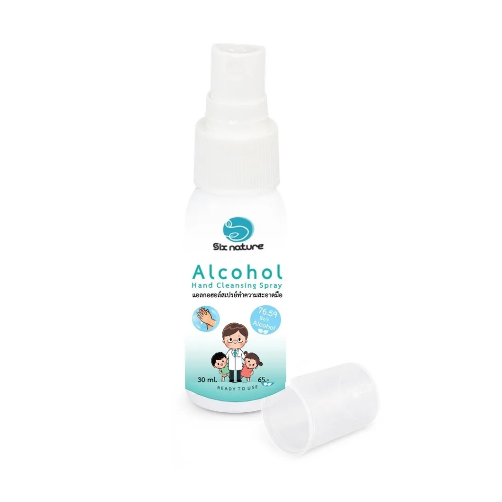 แอลกอฮอล์สเปรย์ทำความสะอาดมือ Six nature Alcohol hand cleansing spray 76.59% 30ml 1000ml ออมไทย