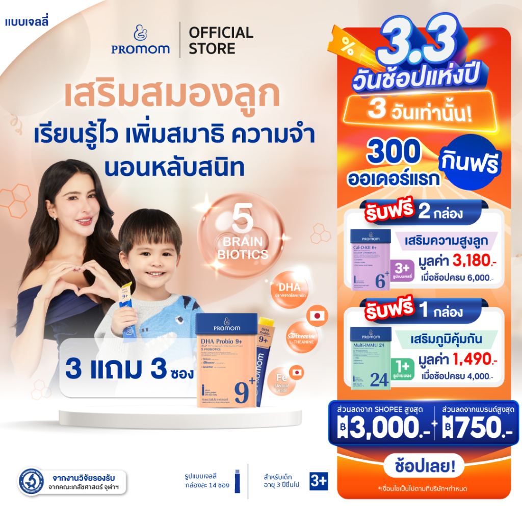 【3 กล่องแถมฟรี 3 ซอง】Promom DHA Probio 9+ พัฒนาสมอง เพิ่มสมาธิและค วามจำ (รูปแบบเจลลี่ สำหรับเด็ก 3 ปี+ รสส้มยูซุ) โปรมัม