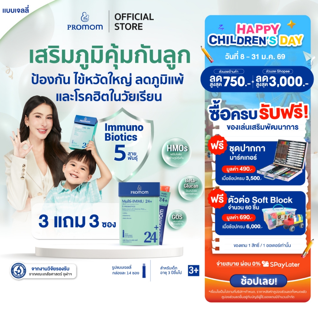【3 กล่องแถมฟรี 3 ซอง】Promom Multi-IMMU 24+ เสริมภูมิคุ้มกัน ลดภูมิแพ้ ป้องกันหวัด (รูปแบบเจลลี่ รสองุ่นเคียวโฮ)
