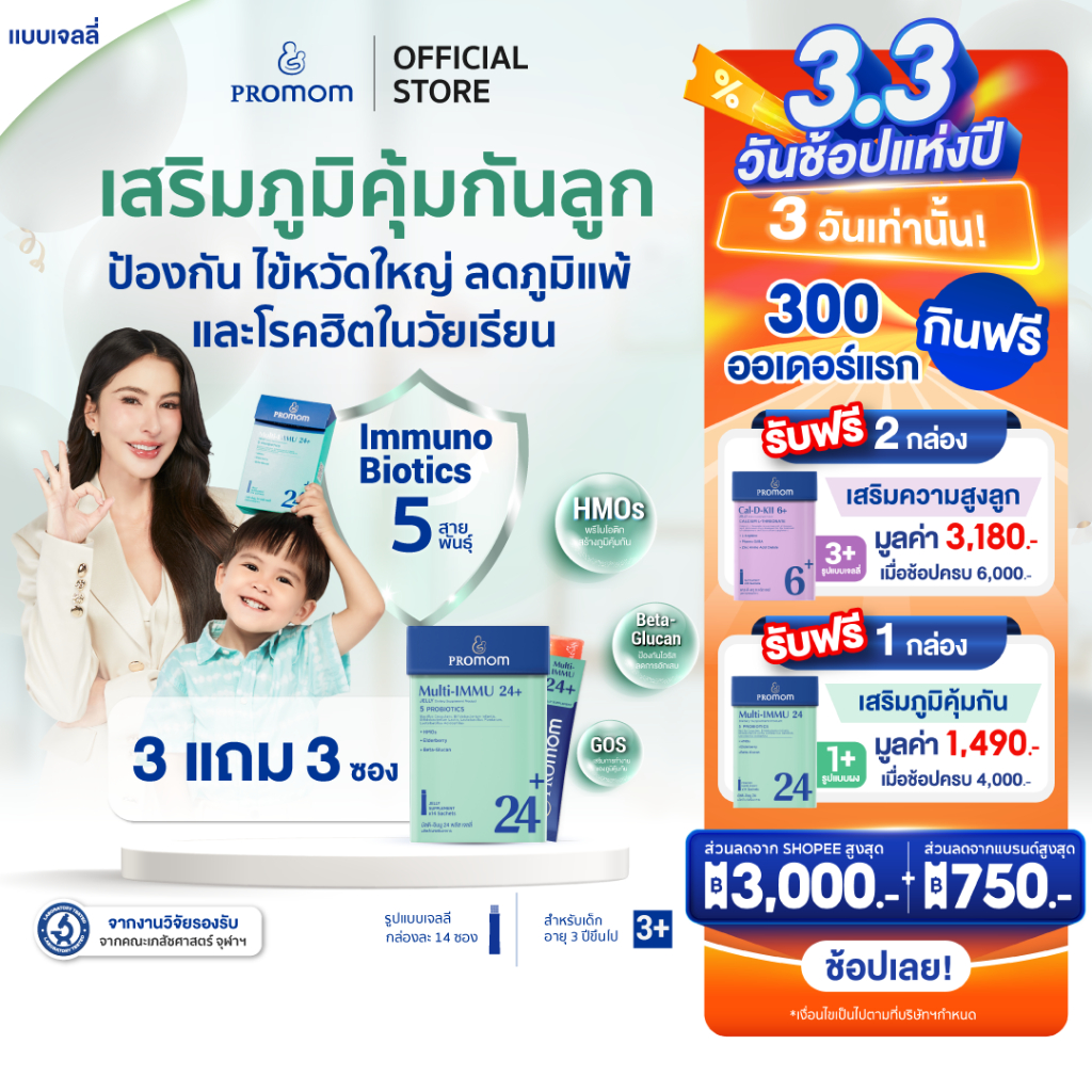 【3 กล่องแถมฟรี 3 ซอง】Promom Multi-IMMU 24+ (รูปแบบเจลลี่ รสองุ่นเคี ยวโฮ) เสริมภูมิคุ้มกัน ลดภูมิแพ้ ป้องกันหวัด