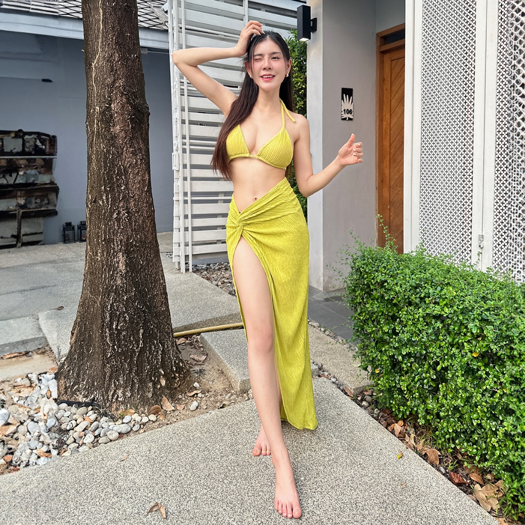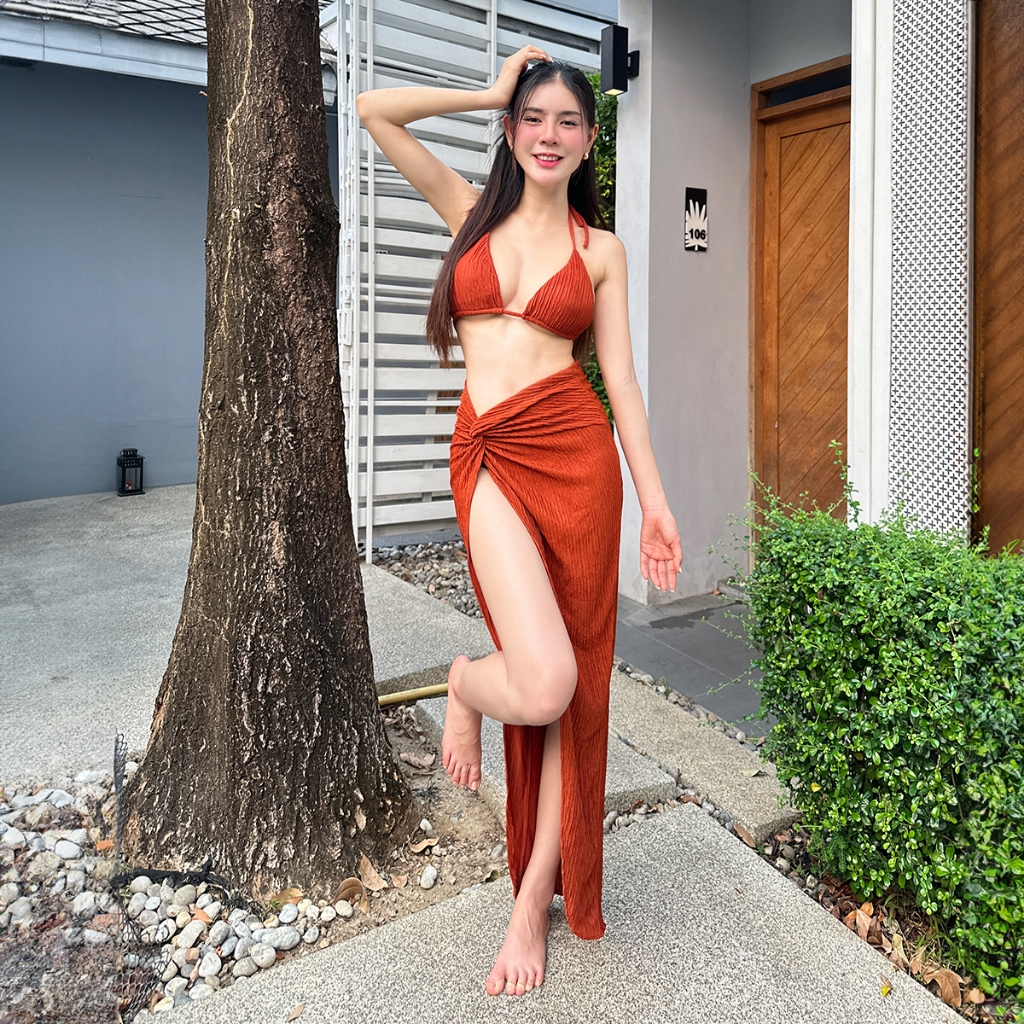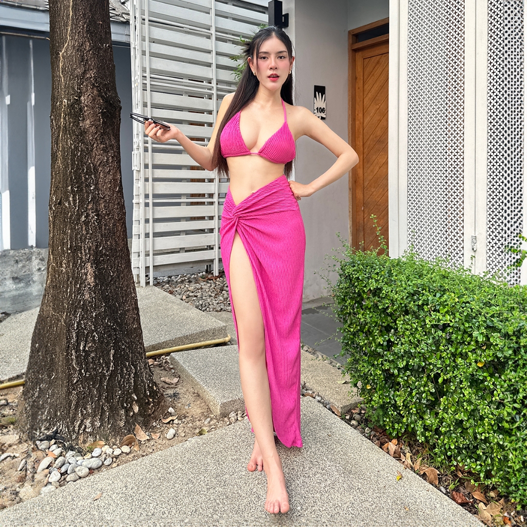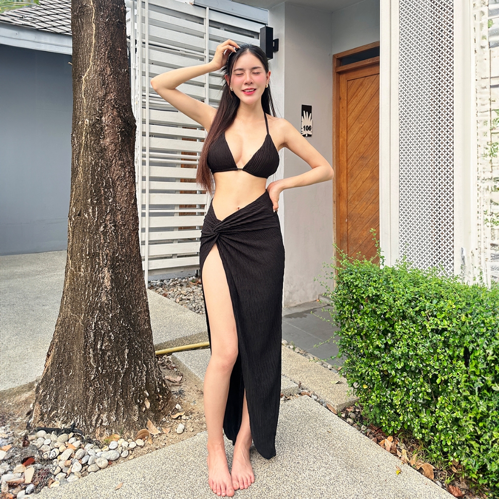 🌈SpinnyHouse🌈ชุดเซ็ต 2 ชิ้น ชุดว่ายน้ำ ใส่ไปทะเล ผ้าเปลือกไม้ 💗 บิกีนี่ + กระโปรงแหวกแต่งบิดช่วงเอว รุ่น เซตบีช