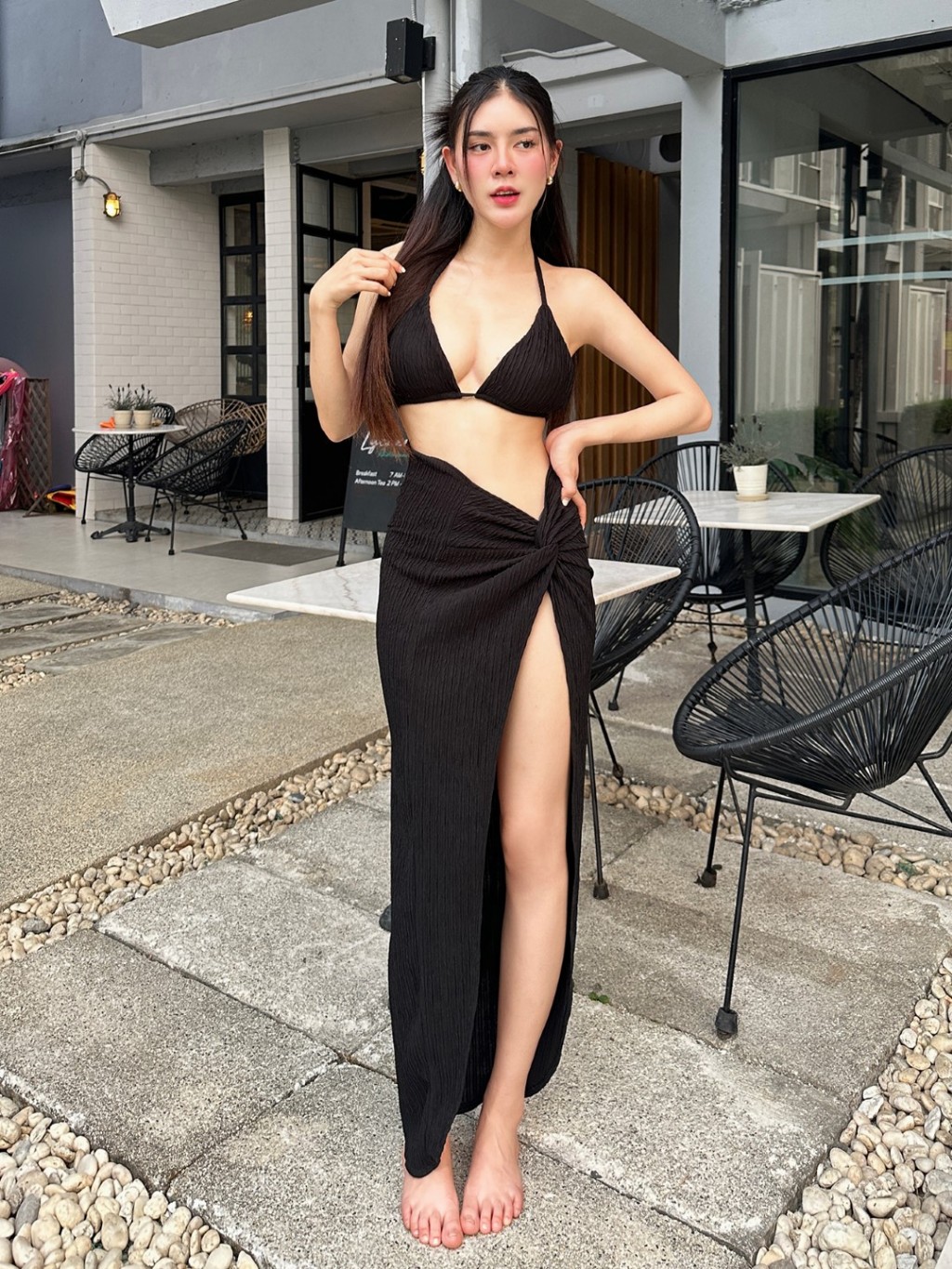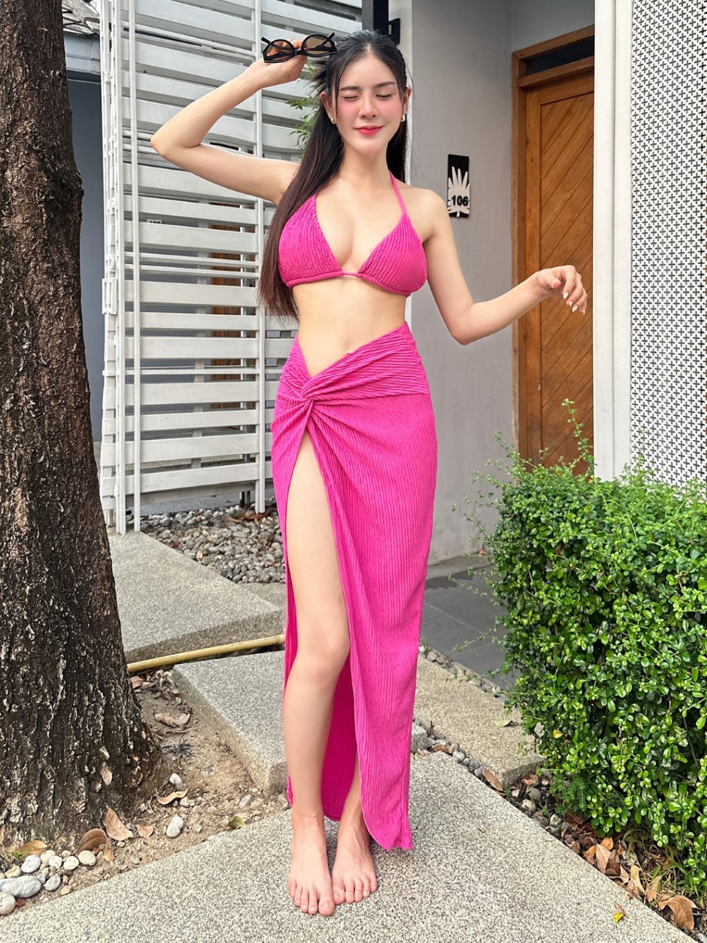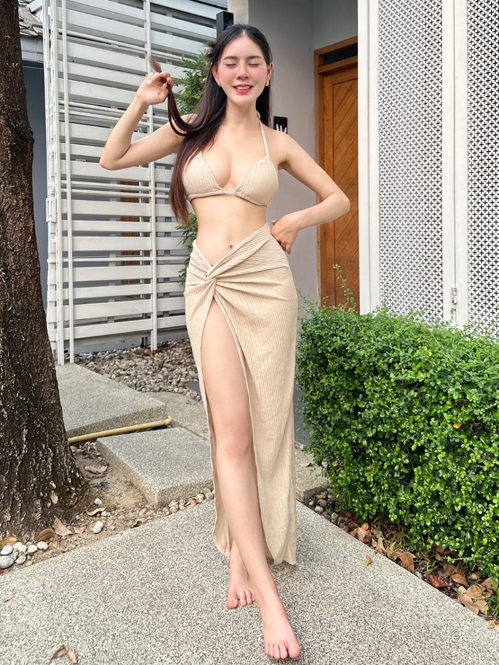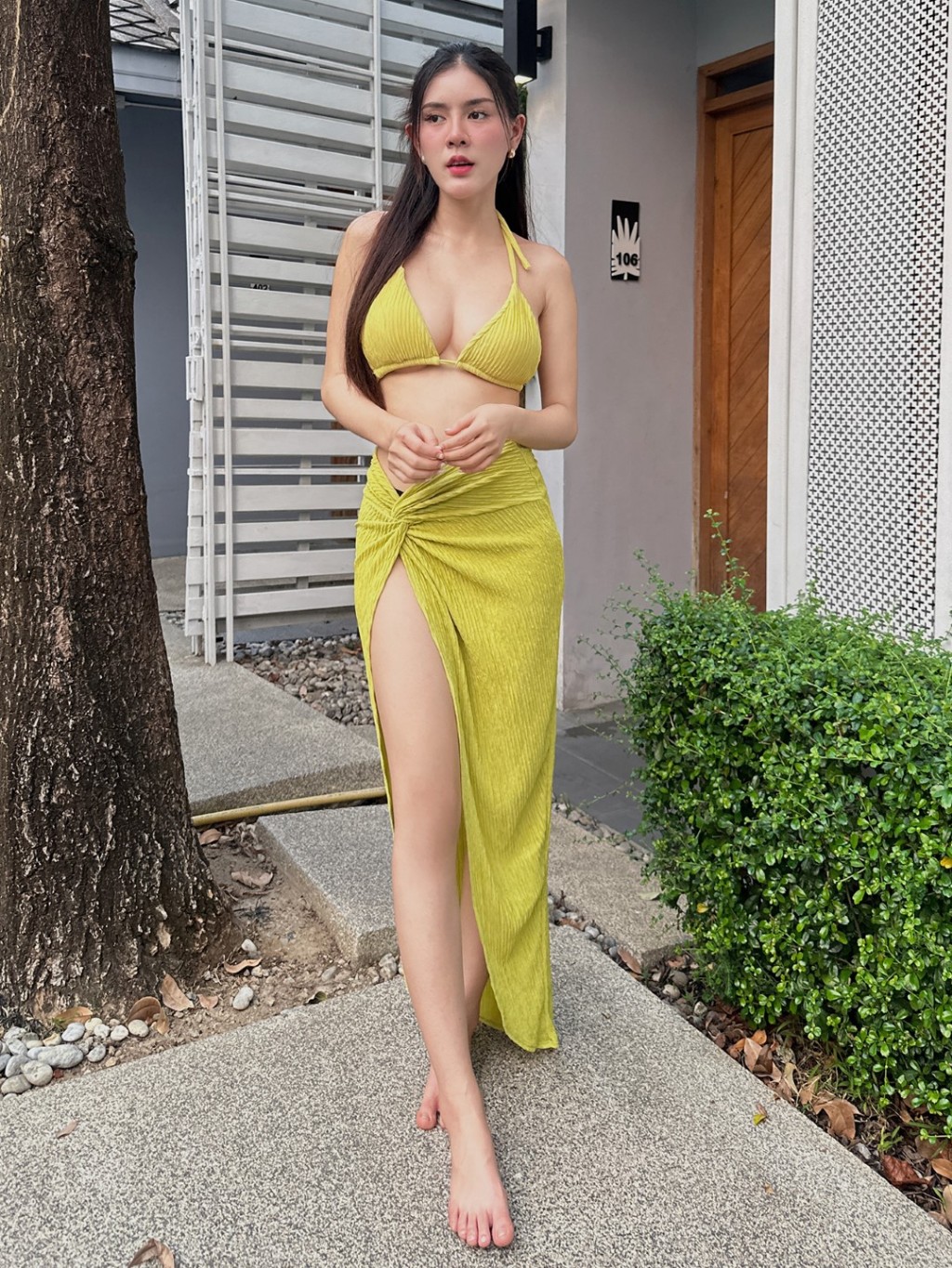 🌈SpinnyHouse🌈ชุดเซ็ต 2 ชิ้น ชุดว่ายน้ำ ใส่ไปทะเล ผ้าเปลือกไม้ 💗 บิกีนี่ + กระโปรงแหวกแต่งบิดช่วงเอว รุ่น เซตบีช