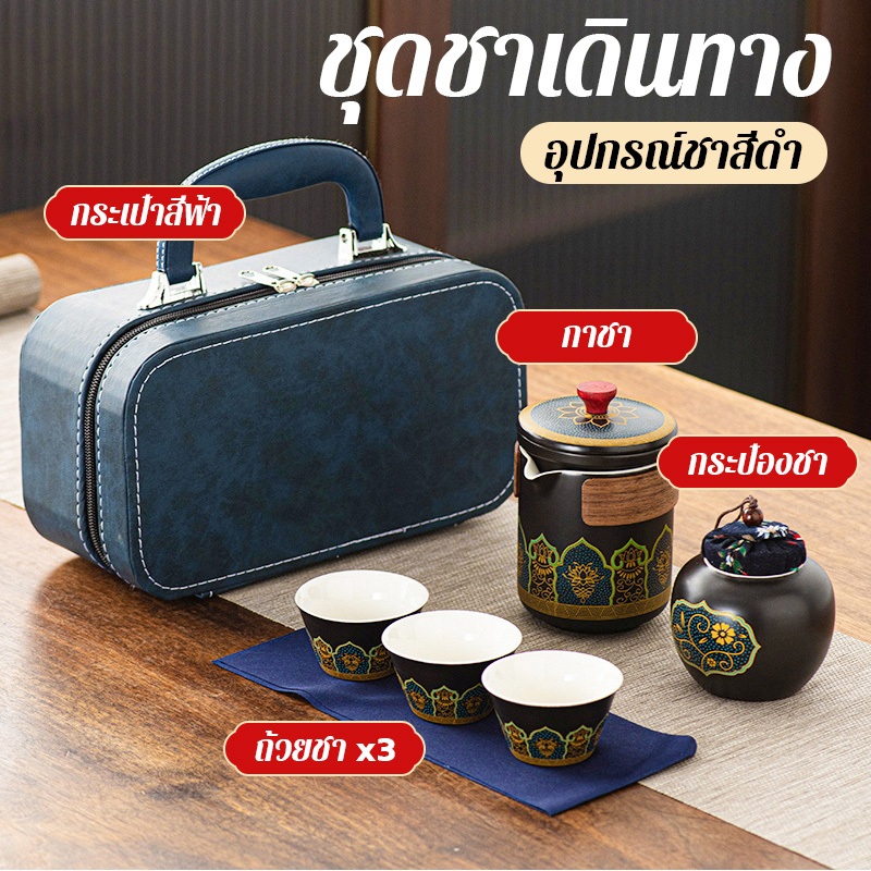 🚀ส่งของจากไทย🚀ชุดกาน้ําชาเซรามิคหนัง สีฟ้า ชุดน้ําชา พร้อมถุงของขวัญ ของขวัญพิเ ศษ ชุดของขวัญเซรามิก พกพาสะดวก