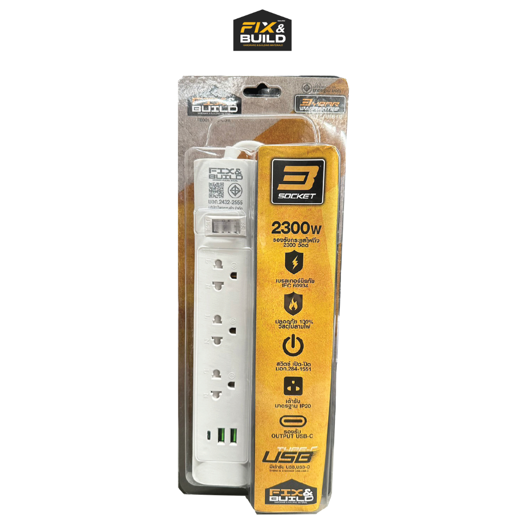 ปลั๊กคอม FIX&BULID ปลั๊กไฟ ปลั๊กสามตา ป้องกันไฟกระชาก มาตรฐาน มอก. สายยาว 3 เมตร