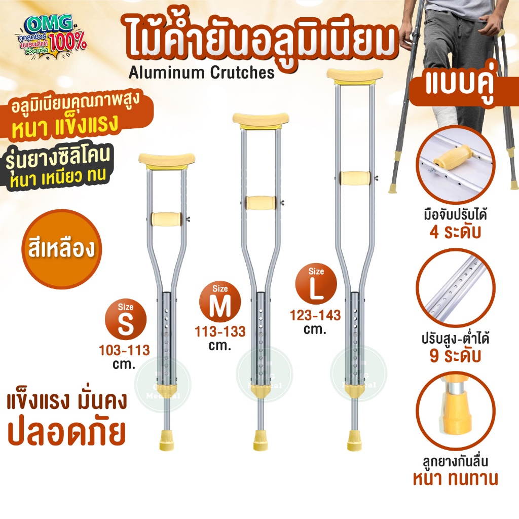 (รุ่นอัพเกรด) ไม้ค้ำยันอลูมิเนียม สีเหลือง Aluminum Crutches แบบคู่ ปรับระดับได้ หนา แข็งแรงกว่าเดิม อุปกรณ์ช่วยพยุงเดิน
