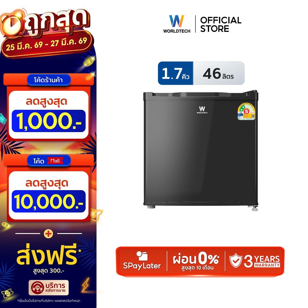 Worldtech ตู้เย็น มินิบาร์ 1.7 คิว มอก. ประหยัดไฟเบอร์ 5 รับประกัน 3 ปี รุ่น WT-MB48