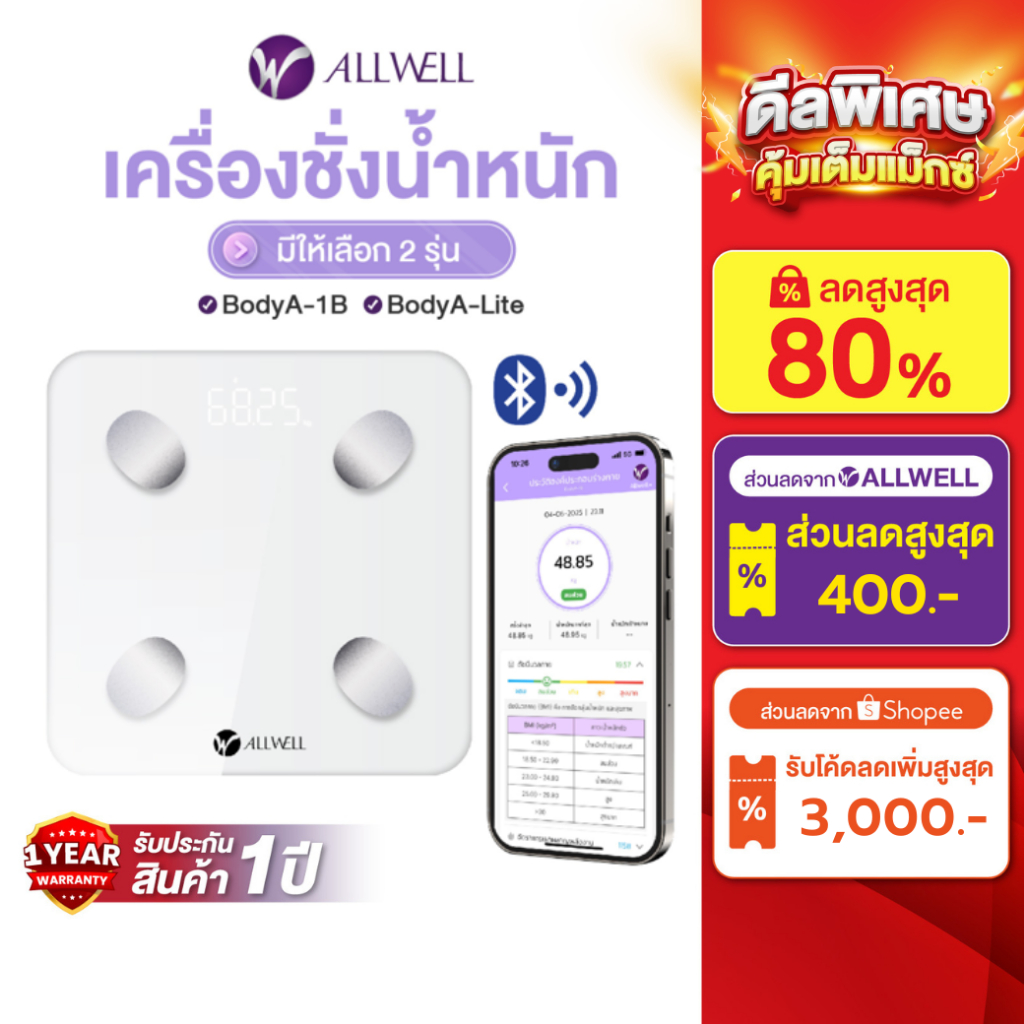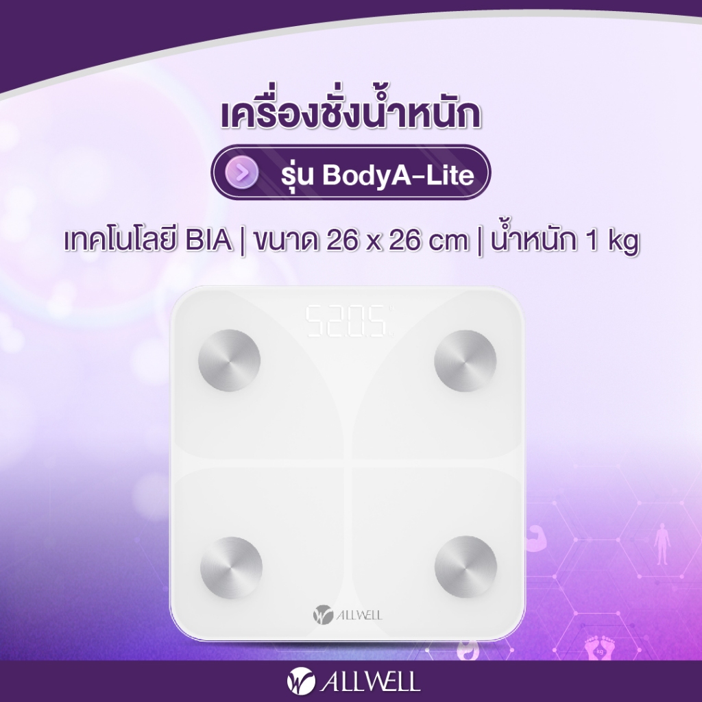 [พร้อมส่ง] ALLWELL เครื่องชั่งน้ำหนัก วัดไขมันและดัชนีมวลกาย เชื่อมแอพได้ วัดค่าสุขภาพ 20ค่า รุ่น BodyA-1B