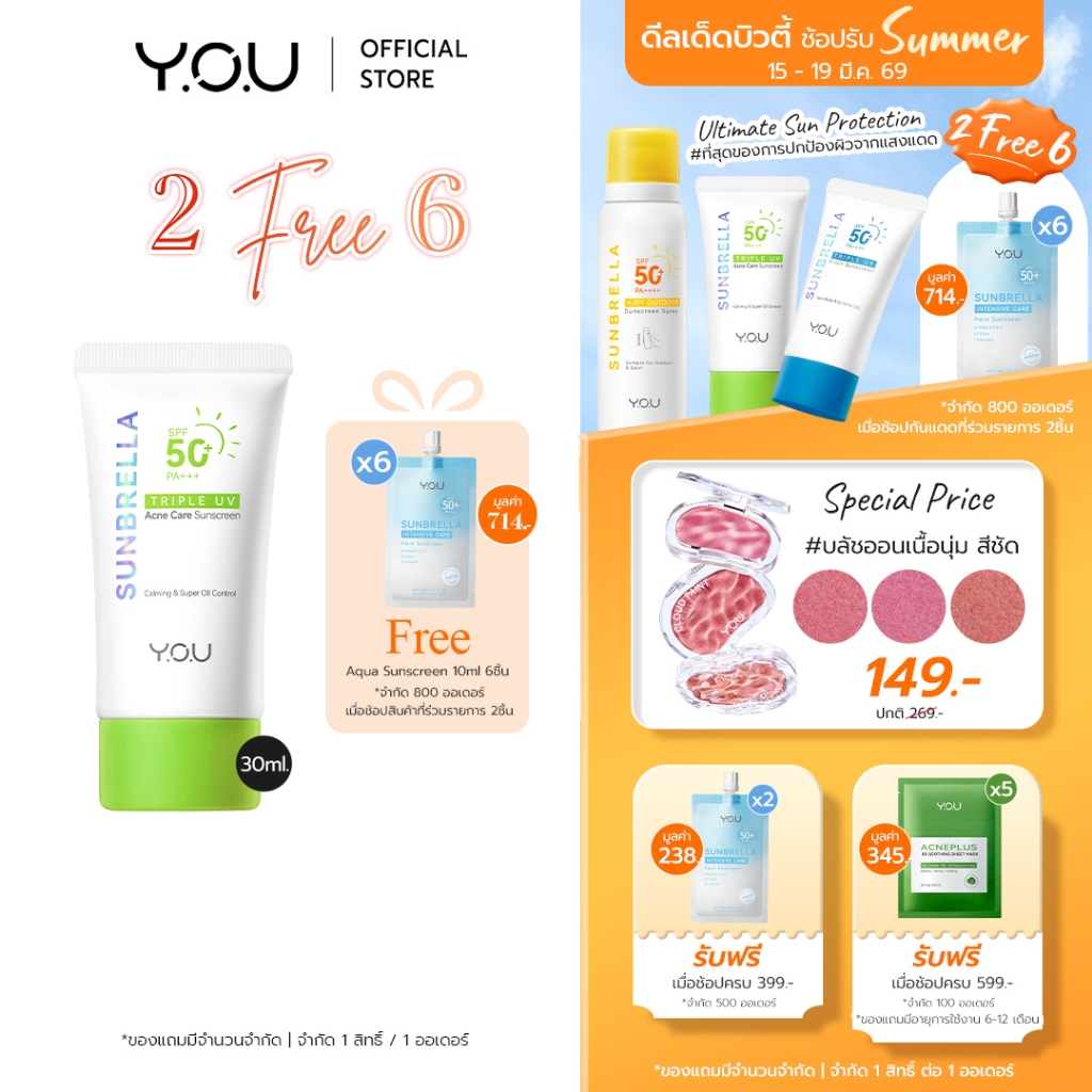 YOU Sunbrella Triple UV Acne Care Sunscreen SPF50+ PA++++ 30ml. ครีมกันแดดเนื้อบางเบา คุมมัน สูตรสำหรับคนเป็นสิว