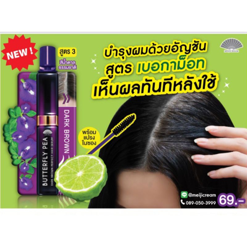 ( 1 ซอง) MEIJI BUTTERFLY PEA DARK BROWN PERFECT HAIR SERUM สูตร 3 เมจิ เซรั่มอัญชัน สูตรเบอกาม็อท (มะกรูด) เติมโคนหงอก