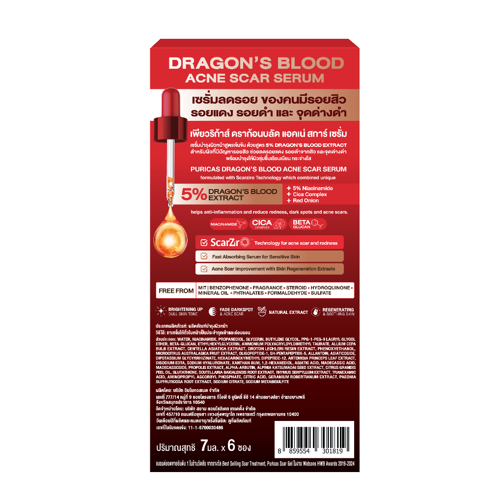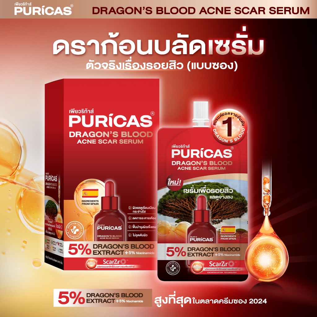 (1 กล่องมี 6 ซอง) Puricas Dragon's Blood Acne Scar Serum 7ml. เซรั่มเพื่อรอยสิว