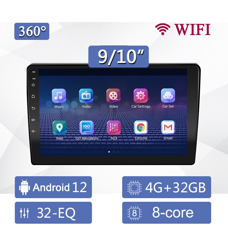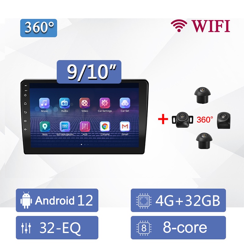 (8Core 4G+32G)360° เครื่องเล่นมัลติมีเดีย 9/10 นิ้ว GPS 2 Din นําทาง สเตอริโอ Android 12 พร้อม 360° ระบบกล้องพาโนรามา นําทาง สเตอริโอ สําหรับรถยนต์