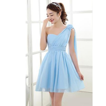 *พร้อมส่ง*ชุดเพื่อนเจ้าสาว ชุดราตรีสั้น ชุดออกงานสีฟ้าแบบไหล่เฉียง ฟรีไซส์ S-M-L