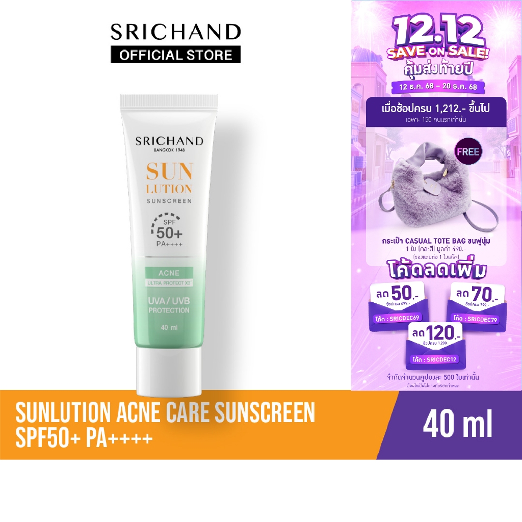 SRICHAND กันแดดสกินแคร์ สูตรคุมมันคุมสิว ซันลูชั่น แอคเน่ แคร์ ซันสกรีน เอสพีเอฟ 50+ พีเอ++++ ขนาด 40 มล.