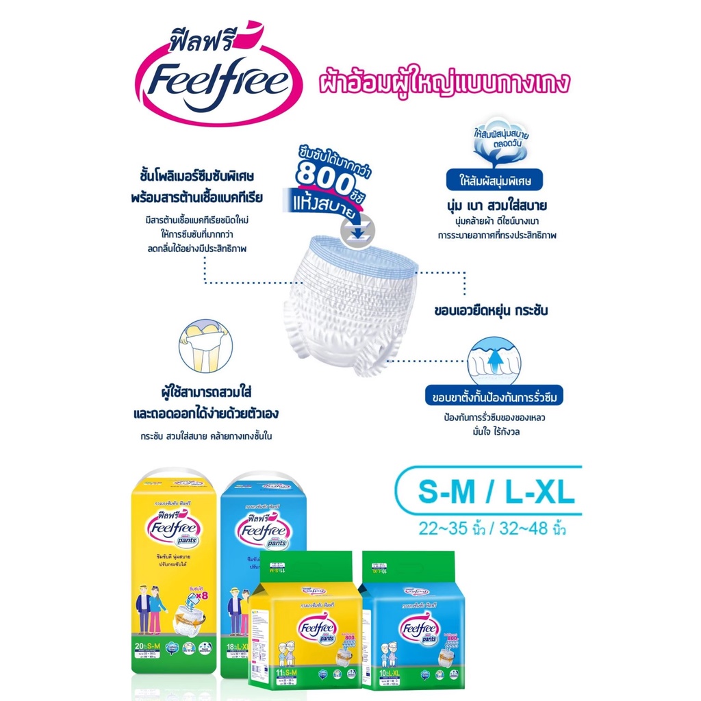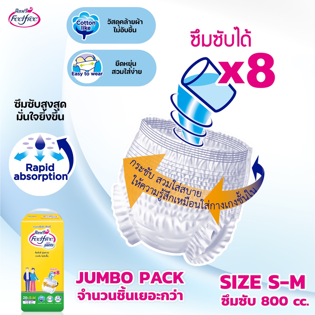 [ขายยกลัง] Feelfreeผ้าอ้อมผู้ใหญ่ฟีลฟรีแบบกางเกง ไซส์ S-M 20ชิ้น*4แพ็ค ซึมซับมากพิเศษ 800CC #C92164