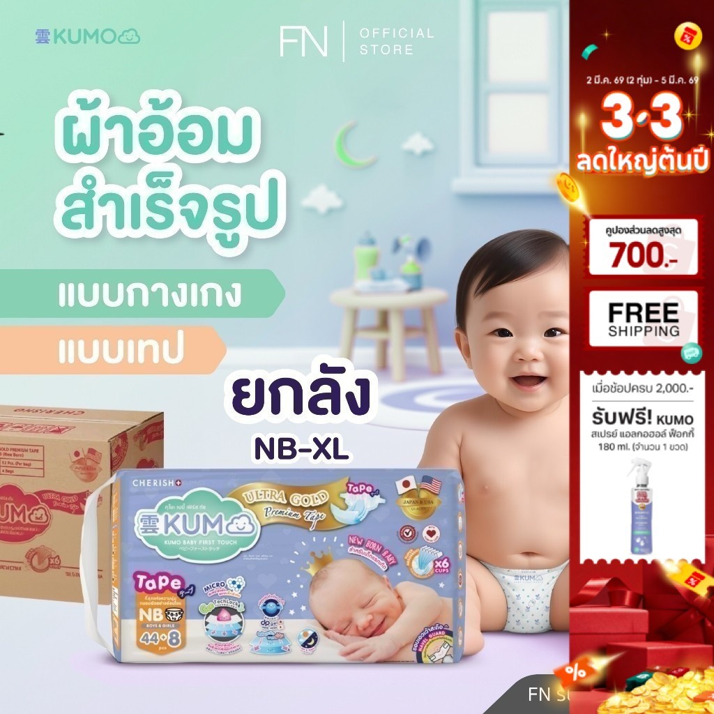 [ยกลัง รวม 4 แพ็ค] KUMO ผ้าอ้อม เด็กสำเร็จรูป แพมเพิส แบบกางเกง แบบเทป ไซส์NB/S/M/L/XL