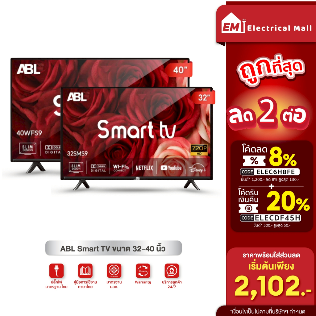 ABL TV สมาร์ททีวี 32-40 นิ้ว Smart TV FULL HD YouTube/netfilx ระบบลำโพงคู่ ดูได้ครบทุกฟังก์ชัน ภาพสวย