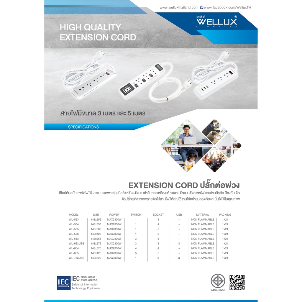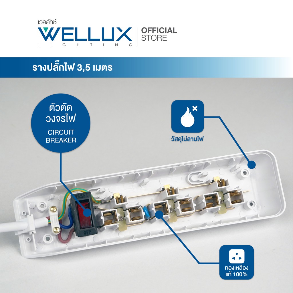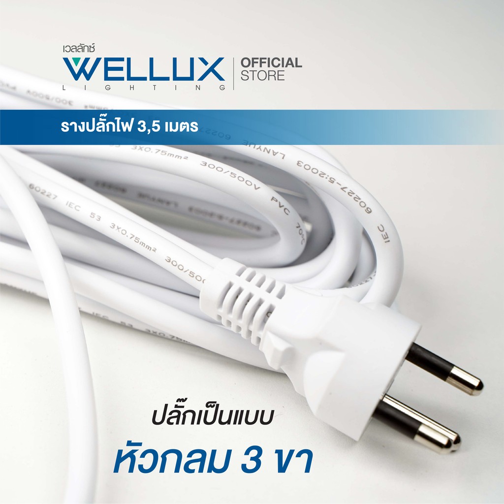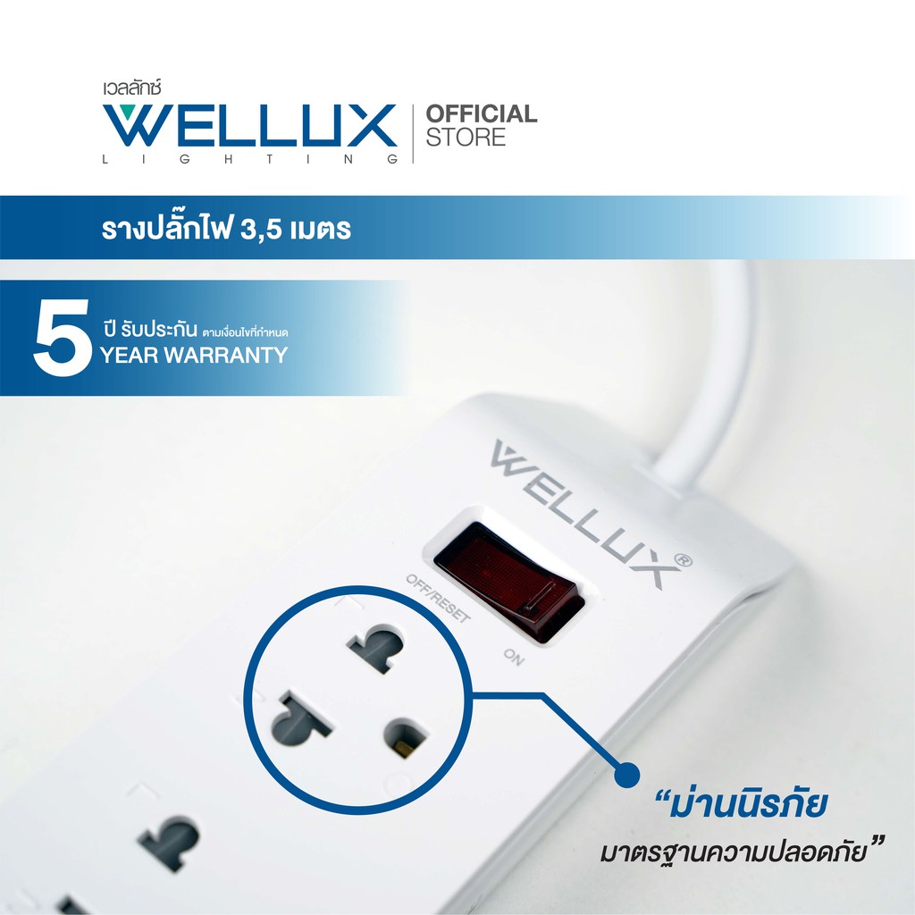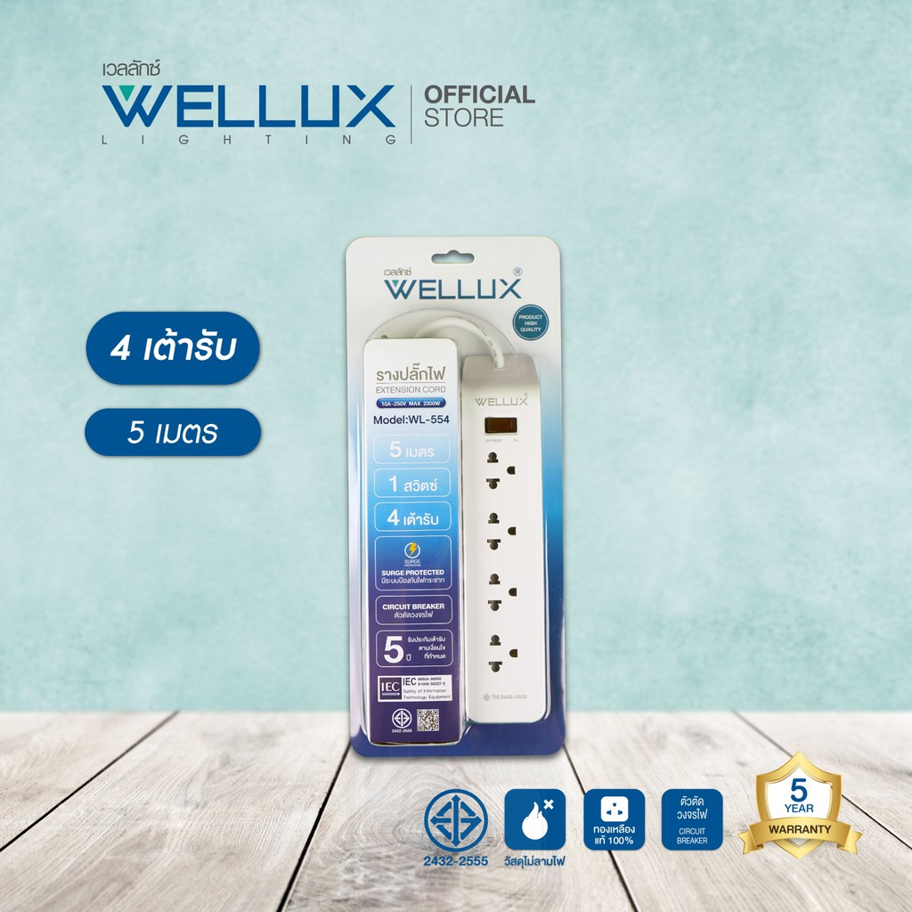 [รุ่น55]WELLUX ปลั๊กไฟคุณภาพ 3,4,5,6 ช่อง ความยาวสายไฟ 3M 5M รองรับกำลังไฟ 2300W เต้ารับทองเหลือง วัสดุไม่ลามไฟ มอก.2433