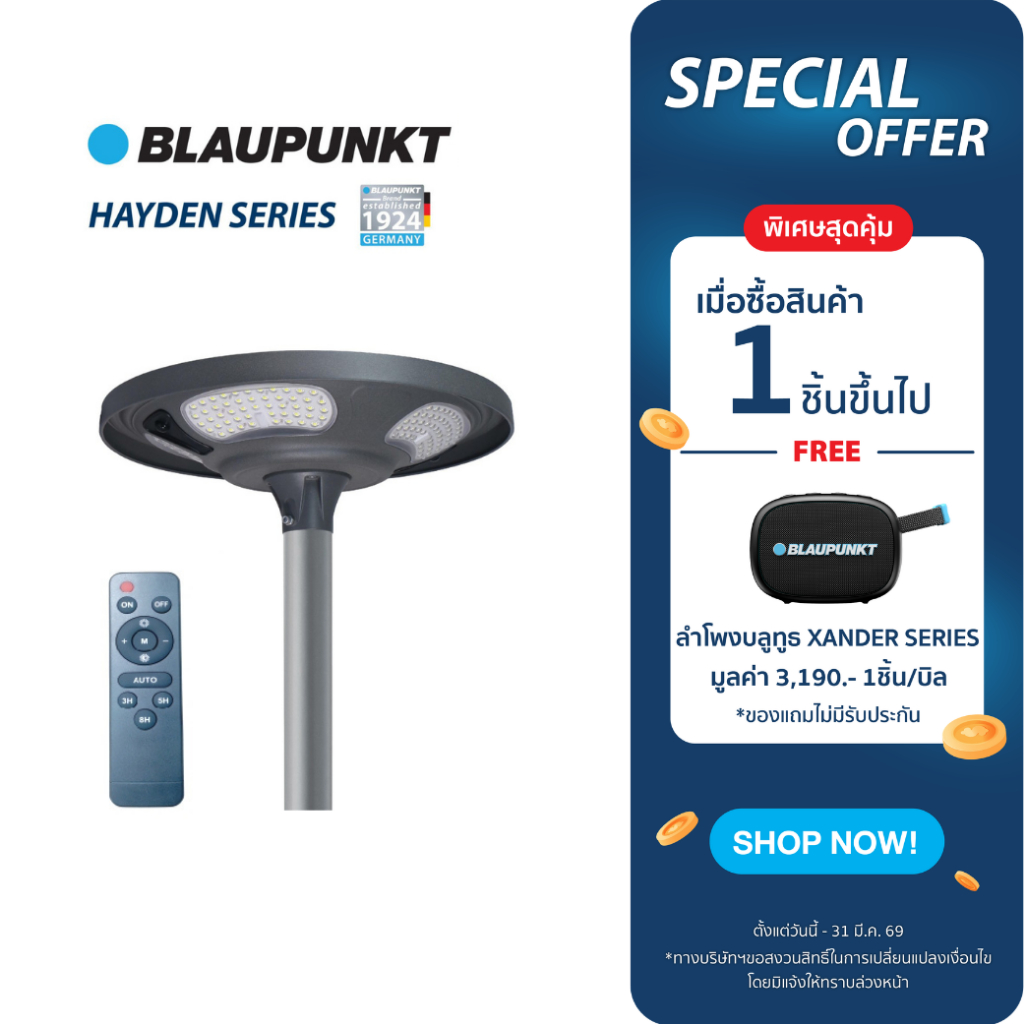 [แถมลำโพงบลูทูธ]BLAUPUNKT โคมไฟพลังงานแสงอาทิตย์ 200W 300W แสงขาว LED SOLAR GARDEN LIGHT