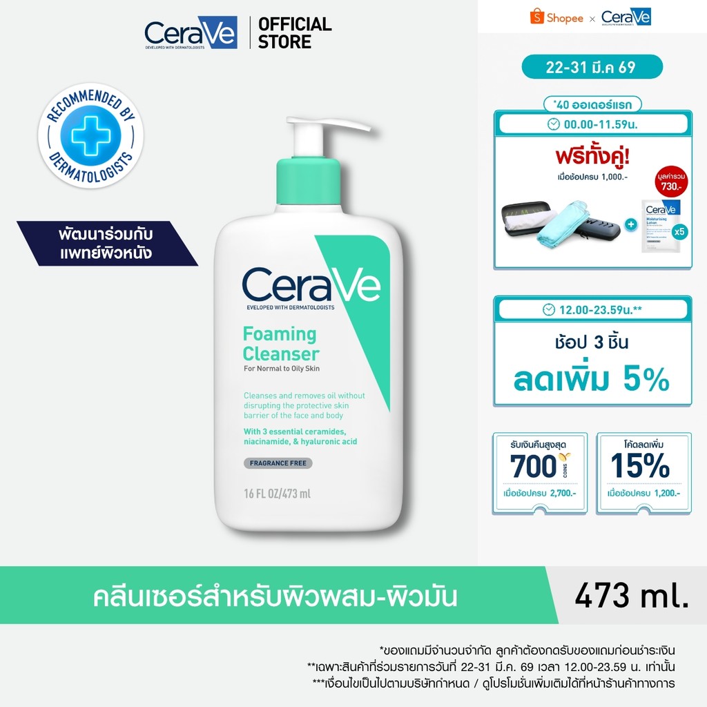 เซราวี CERAVE Foaming Cleanser โฟมทำความสะอาดผิวหน้าและผิวกายสำหรับผิวมัน สูตรสำหรับผิวมัน-ผสม 473ml.