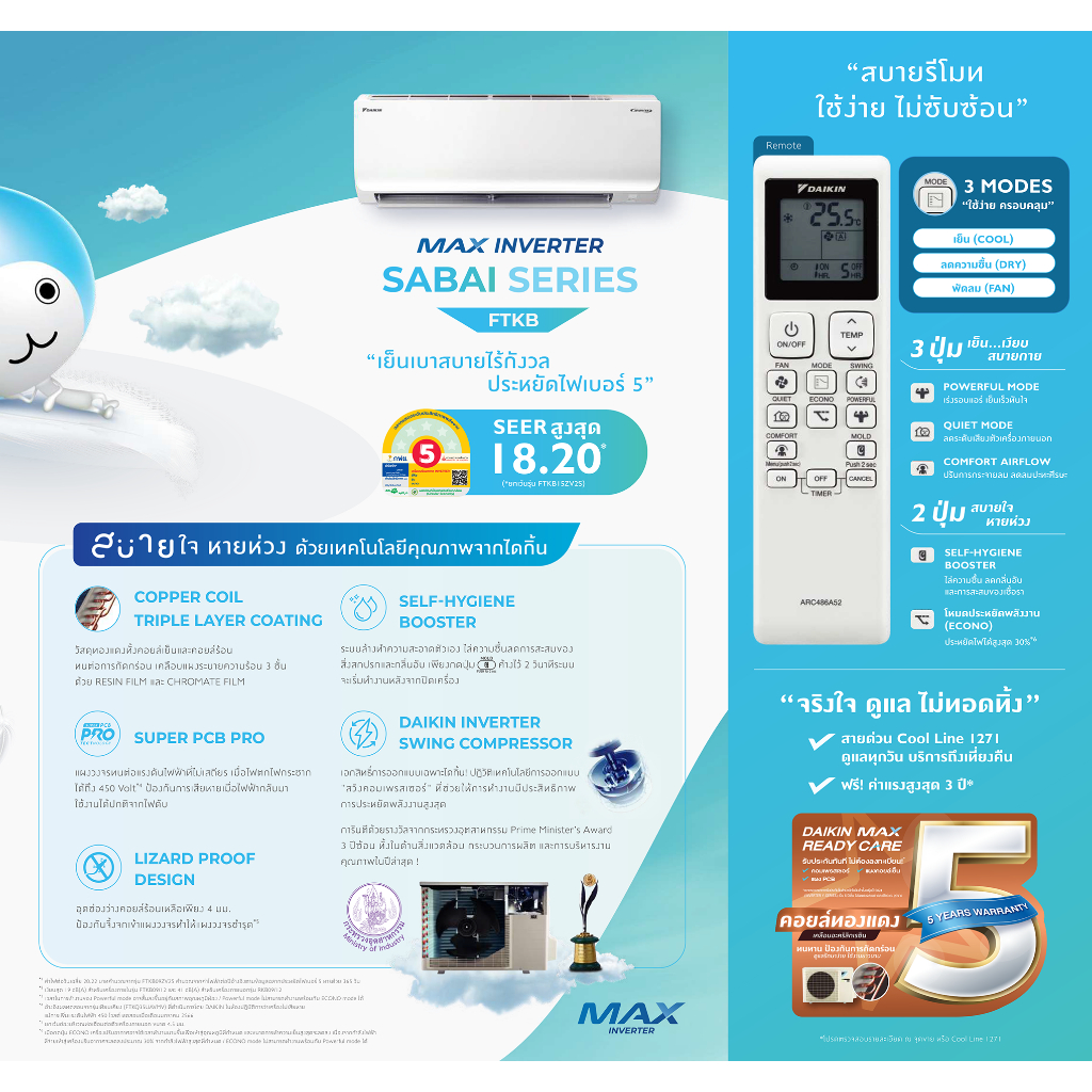 [ส่งฟรี] Daikin FTKB-Z SABAI MAX Inverter 9000-24000BTU ปี 2025 แถมฟรีท่อสำเร็จ แถมฟรีผ้าห่ม
