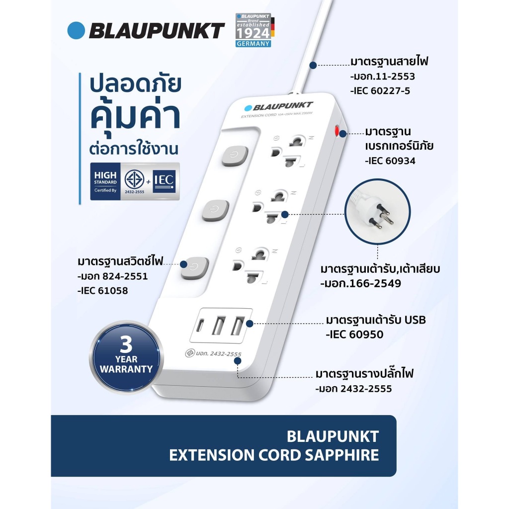 [ซื้อครบ990แถมพัดลมมือถือ]BLAUPUNKT ปลั๊กไฟมินิมอล สวิตช์แยก 3-5 ช่อง มาตรฐาน มอก.ทองเหลืองแท้ 100%