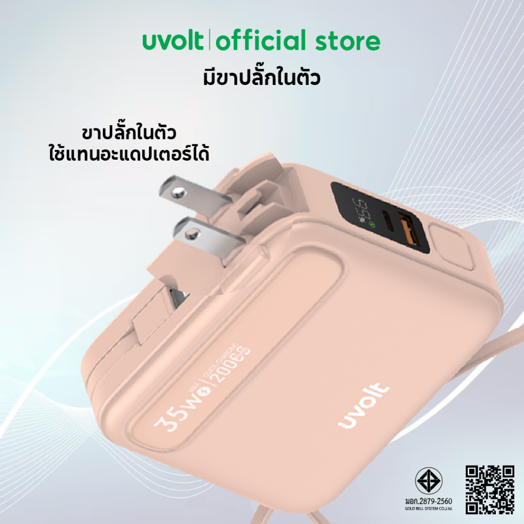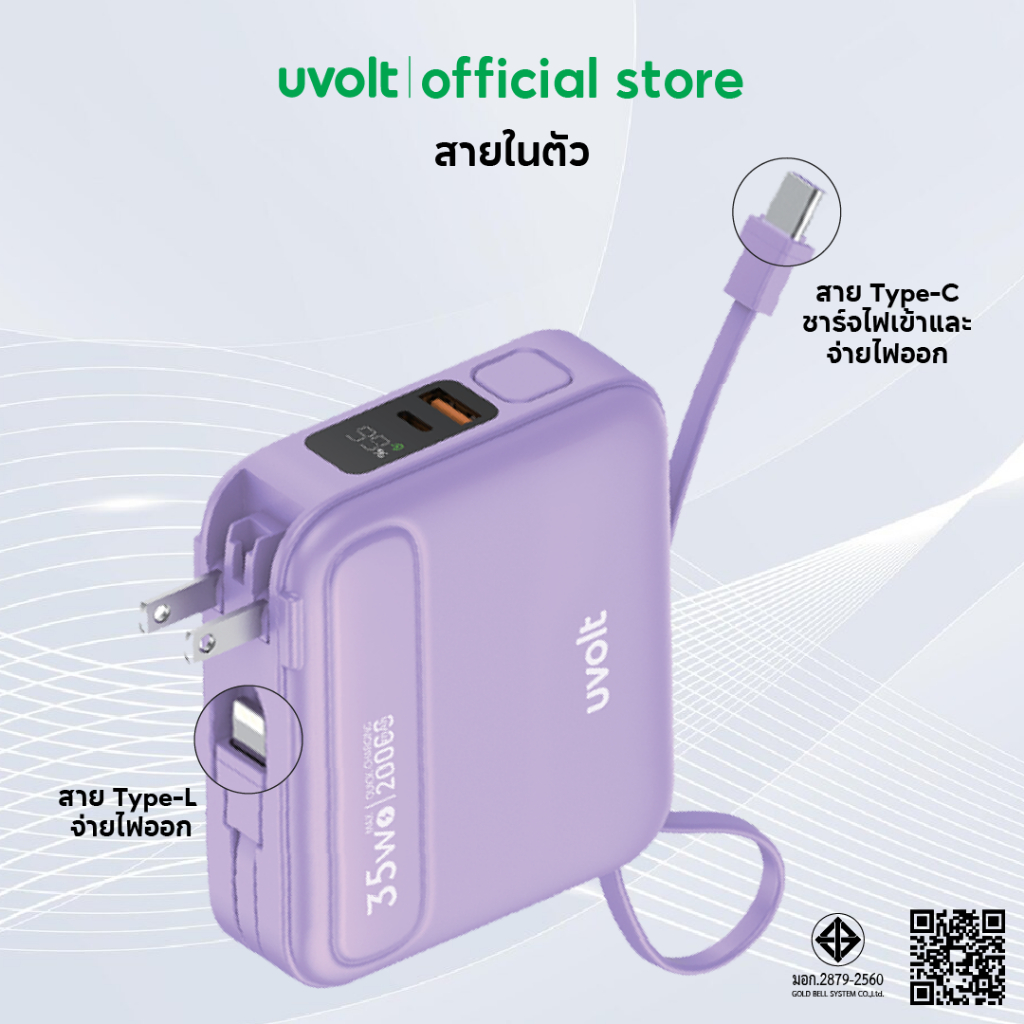 [รับประกัน 2 ปี] Uvolt PD35W พาวเวอร์แบงค์ชาร์จเร ็ว สายในตัว Powerbank 4in1 20,000mAh Fast Charge UVP20AC-01 จอLED