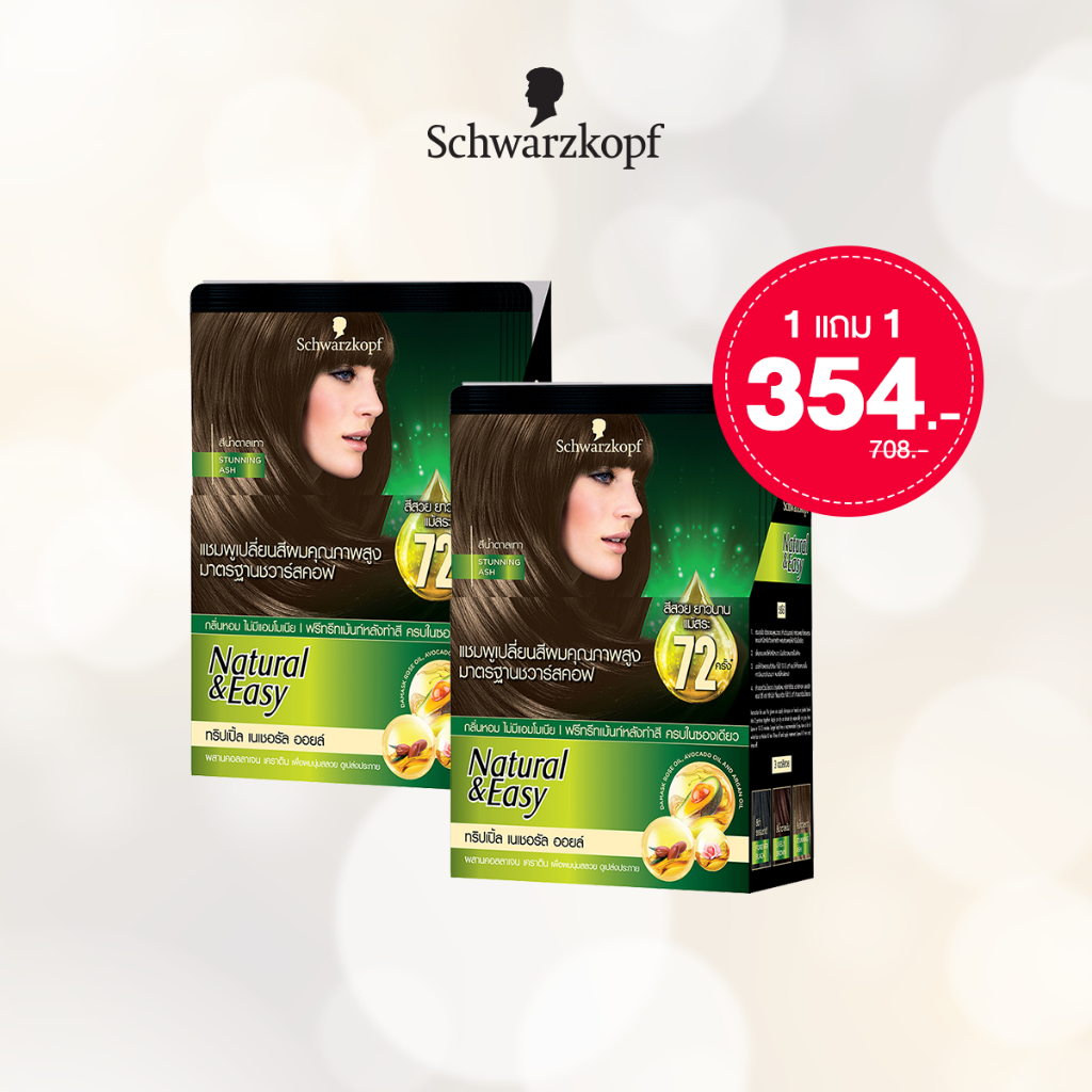 [1แถม1] Schwarzkopf Natural & Easy Hair Color Shampoo Stunning Ash แฮร์คัลเลอร์แชมพู สีน้ำตาลเทา 1 กล่อง