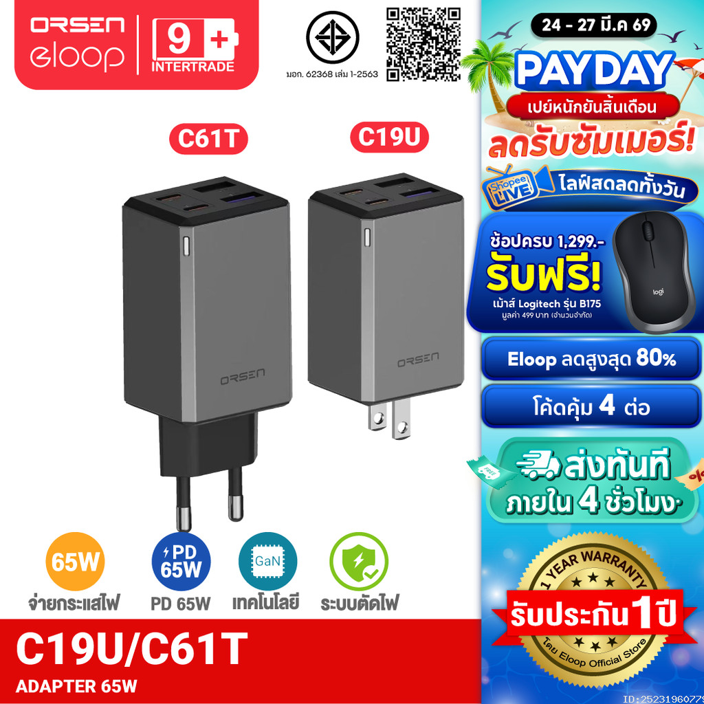 [606บ. ส่งด่วน] Orsen by Eloop C19U C61T หัวชาร์จเร็ว GaN 65W 4 พอร์ต USB Type C PD QC PPS Adapter ปลั๊ก EU