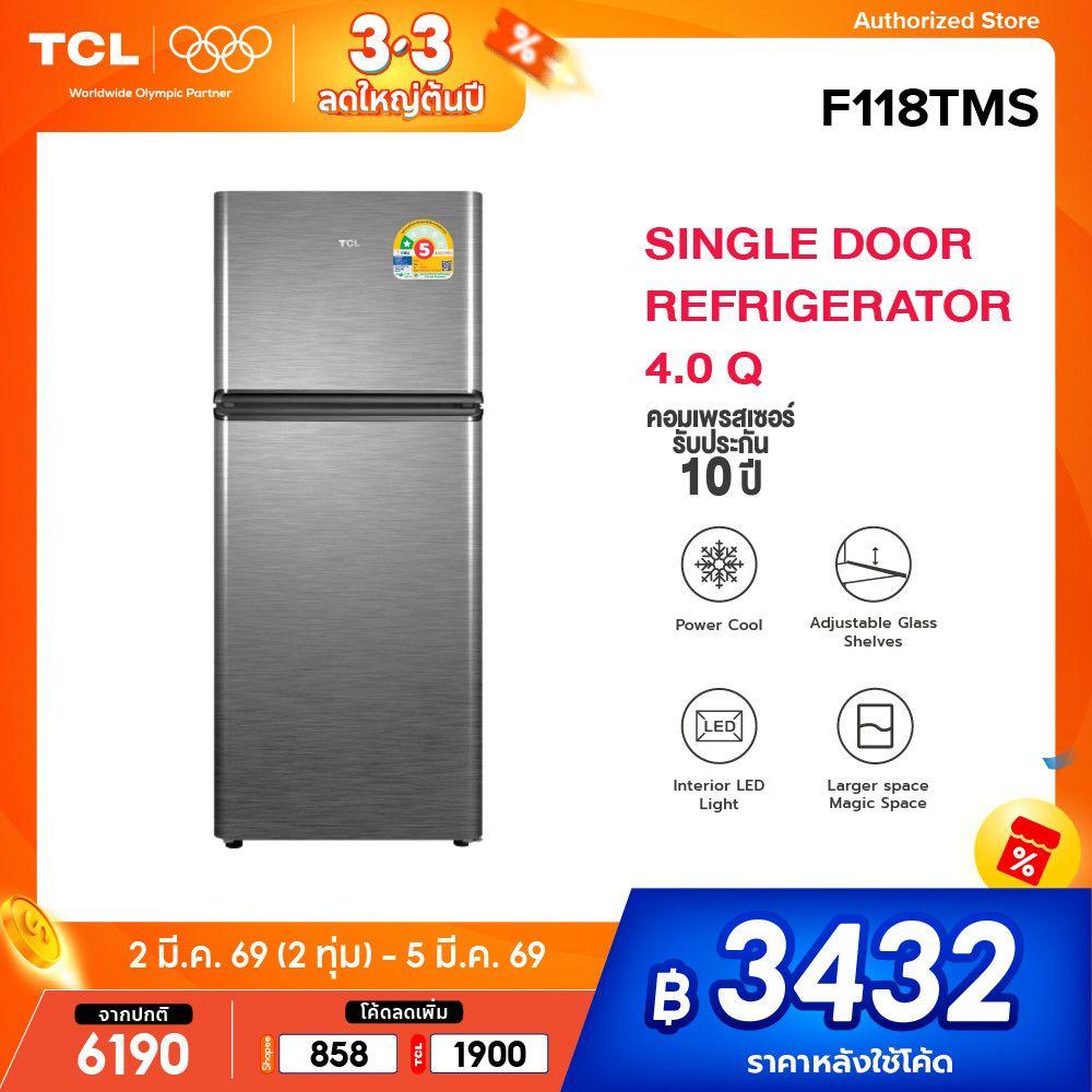 TCL ตู้เย็น 2 ประตู ขนาด 4 Q / 113 ลิตร สีเงินหรือเทา รุ่น F118TMS ระบบความเย็นแบบ Defrost ส่งฟรี