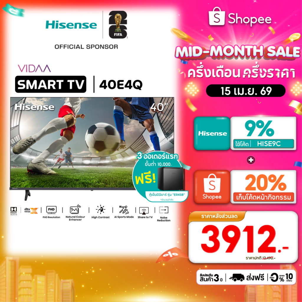 Hisense ทีวี 40 นิ้ว Full HD VIDAA Smart TV รุ่น 40E4Q