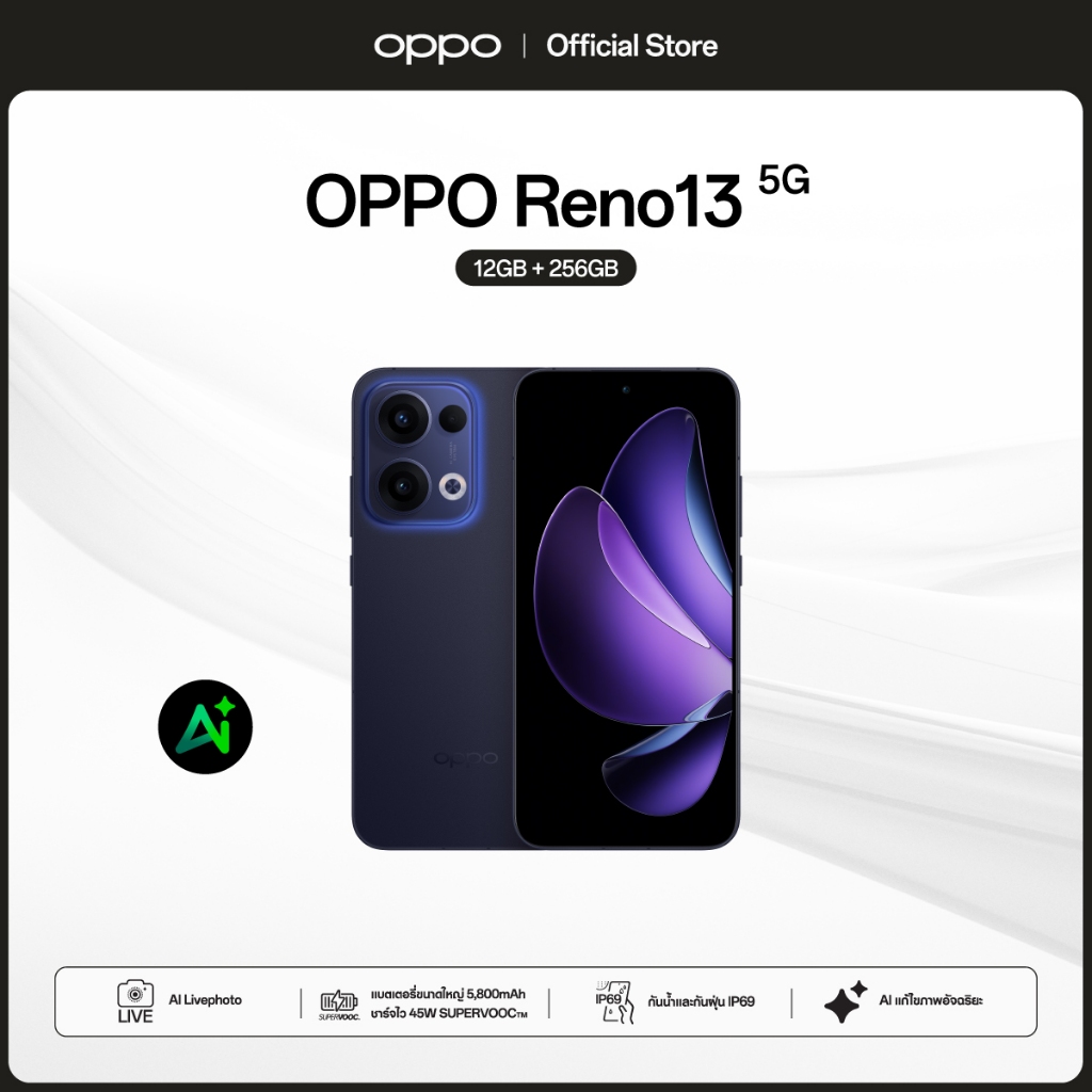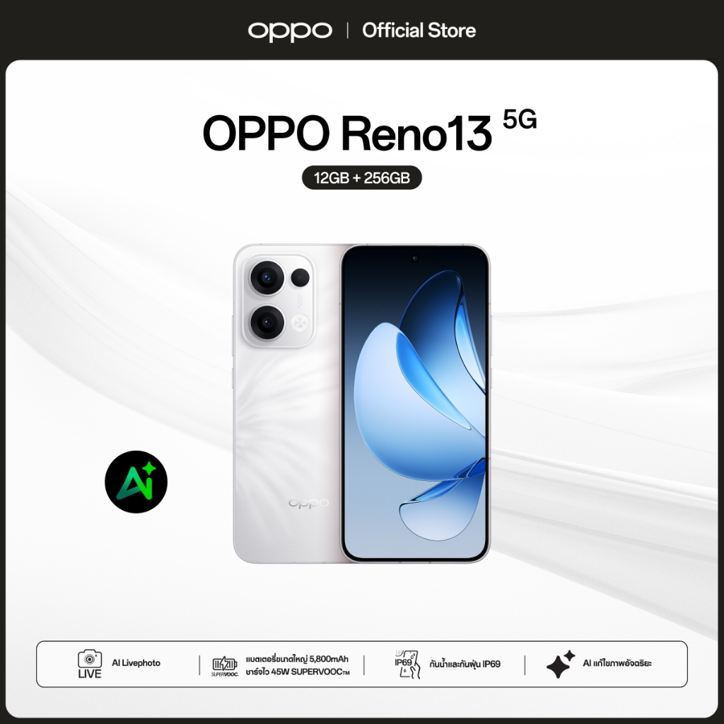 OPPO Reno13 5G(12+256G) โทรศัพท์มือถือดีไซน์สวย AI อัจฉริยะ กันน้ำ/กันฝุ่น IP69 กล้อง 50 MP ชาร์จไว80W แบต 5600mAh