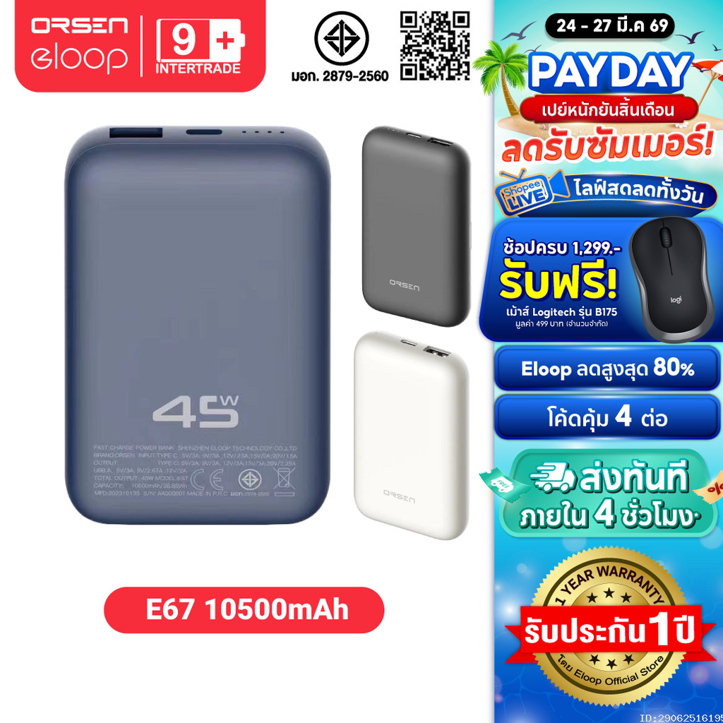 [674บ. ส่งด่วน] Orsen by Eloop E67 แบตสำรอง 10500mAh ชาร์จเร็ว PD 45W USB Type C Power Bank ของแท้
