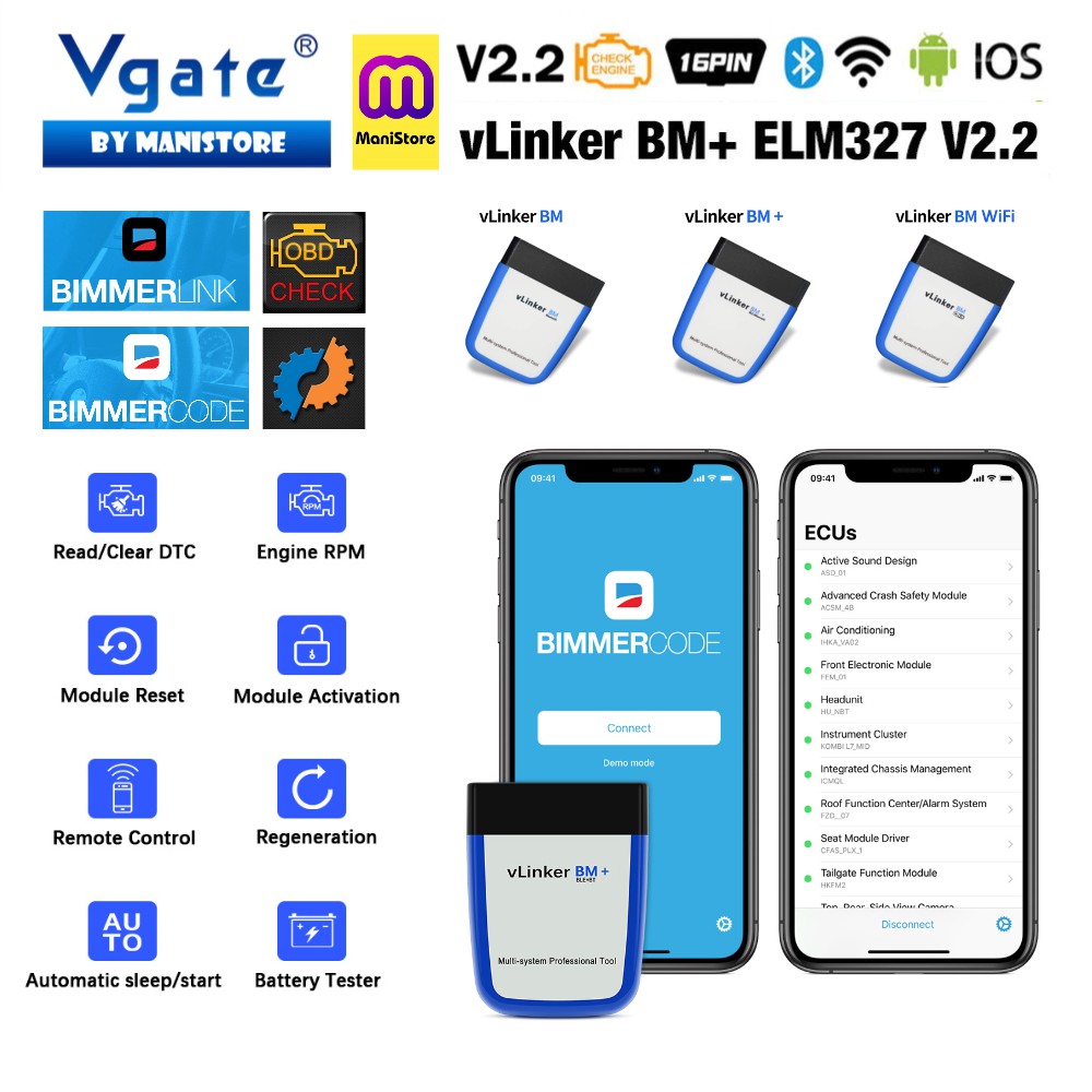 [Vgate] vLinker BM+ ELM327 V2.2 Bluetooth 3.0/ BLE 4.0/ WiFi Official BimmerCode BimmerLink OBD2 Car Coding and Scanner