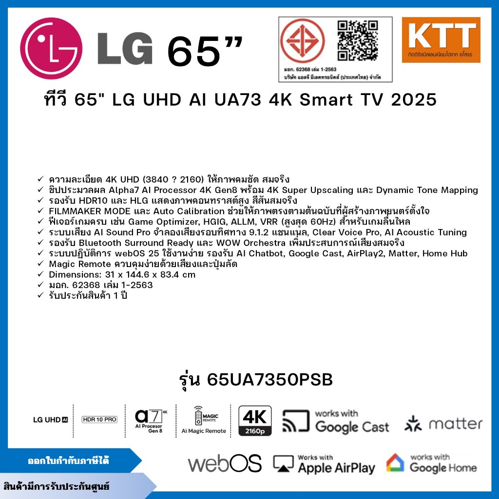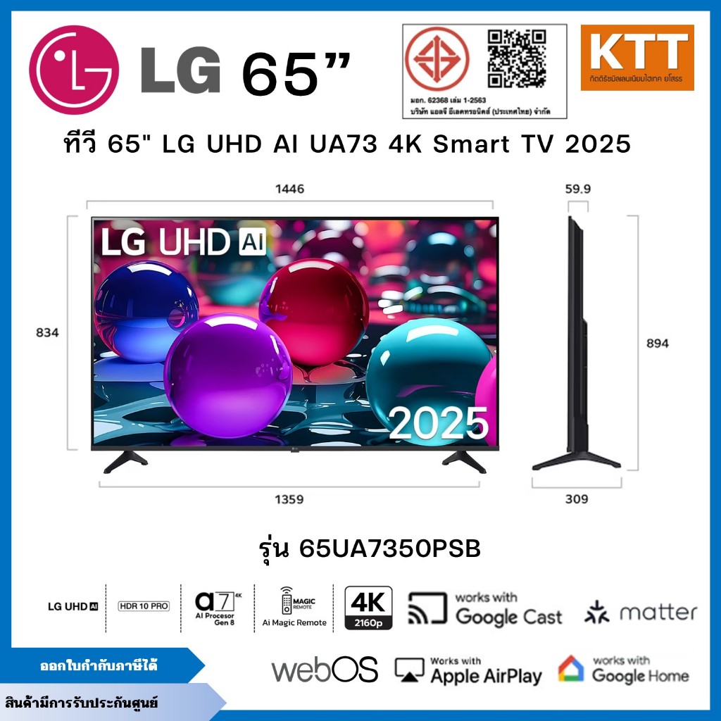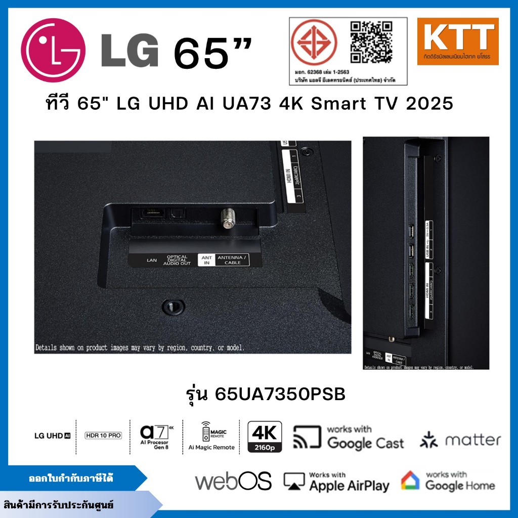 LG TV ทีวี AI UA73 สมาร์ททีวี 65 นิ้ว 4K UHD LED รุ่น 65UA7350PSB.ATMQ ปี 2025
