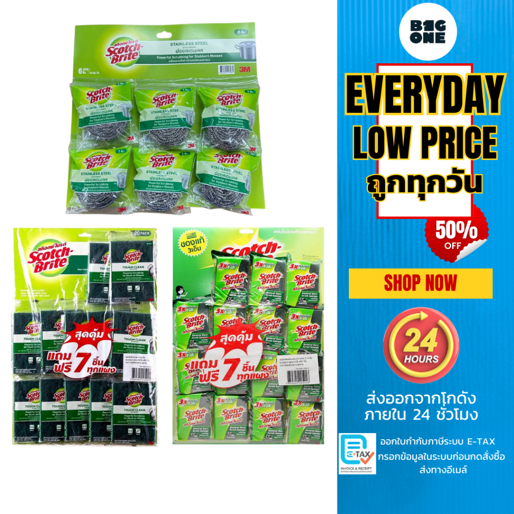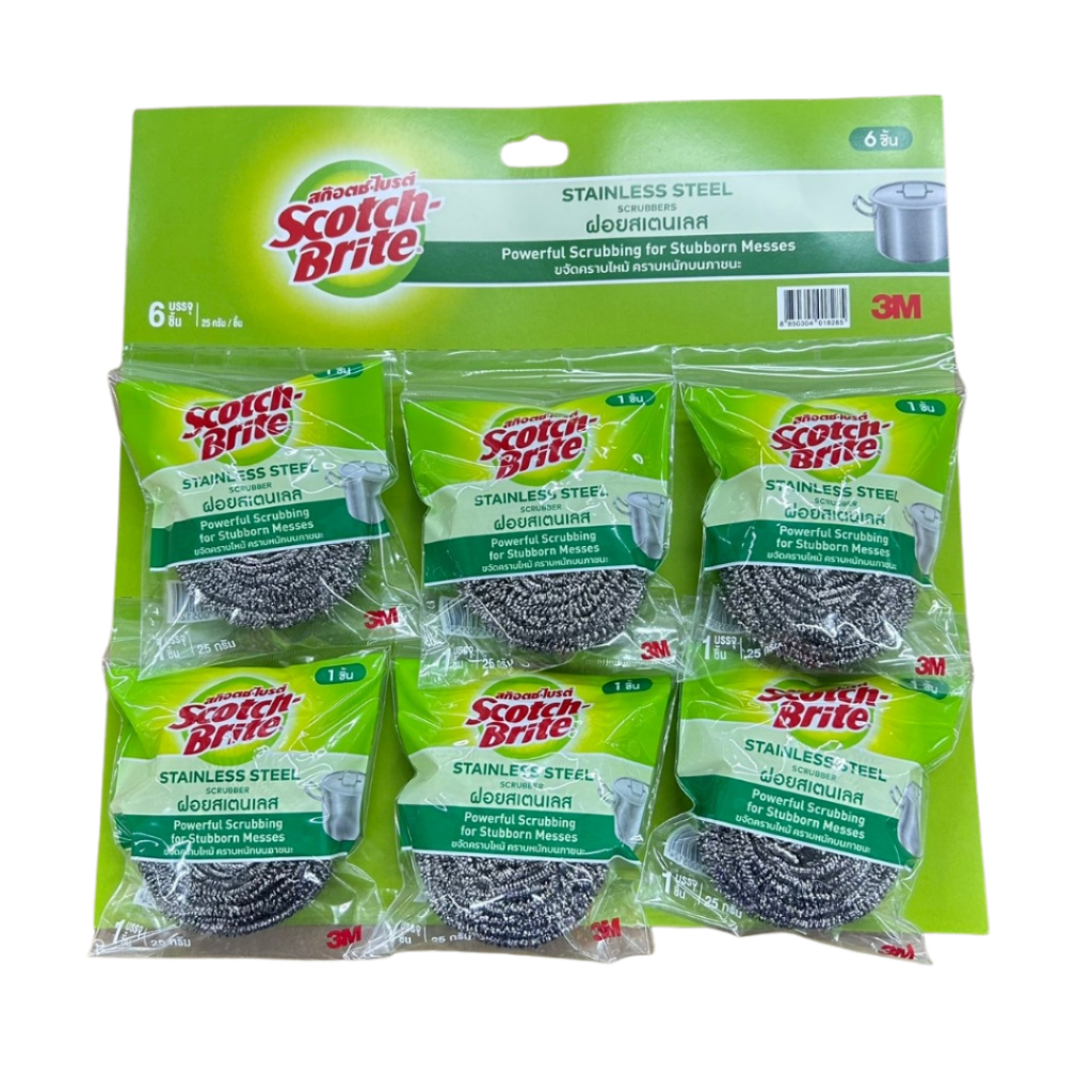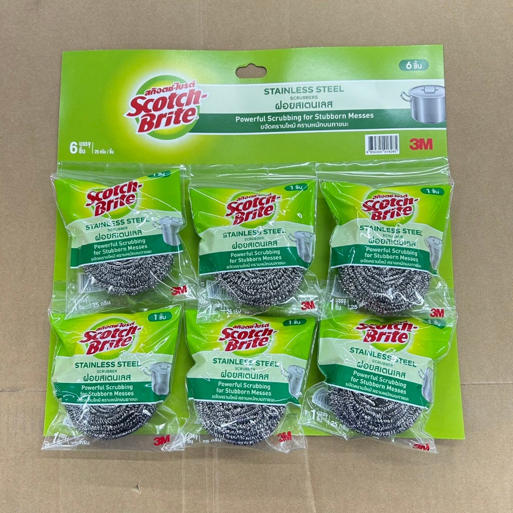 3M Scotch-Brite สก๊อตช์-ไบรต์ ฝอยสเตนเลส แพ็ค 6 ชิ้น ขนาด 25 กรัม และฟองน้ำพร้อมใยขัด และใยขัดทำความสะอาด