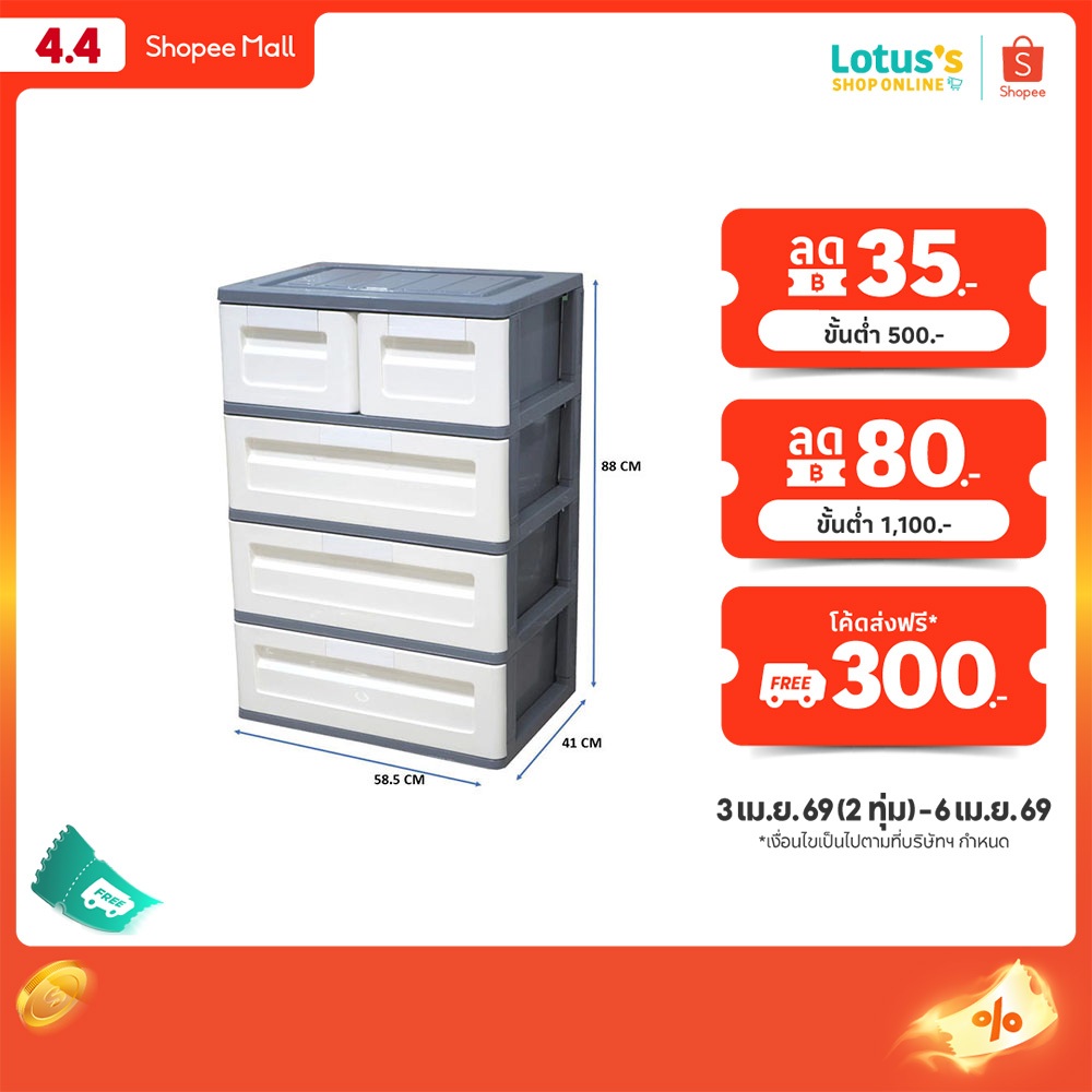 โลตัส ตู้ลิ้นชักแฝด DIY 4 ชั้น ขนาด 58.5 x 41 x 88 ซม สีเทาขาว LOTUSS TWIN DRAWER 4 TIERS 58.5 X 41 X 88 CM. GRAY-WHITE