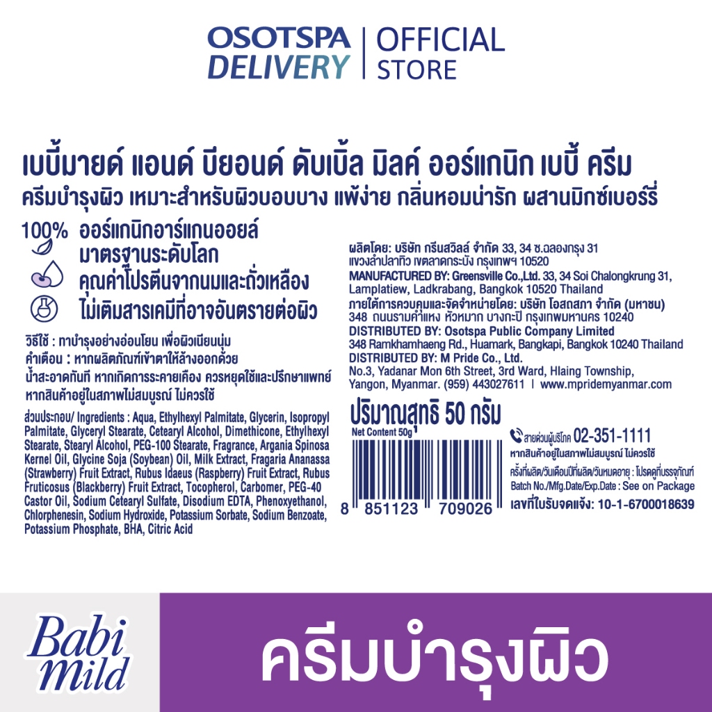 เบบี้มายด์ เบบี้มายด์ครีม ดับเบิ้ลมิลค์ ออร์แกนิก 50กรัม / Babi Mild Cream Double Milk Organic 50g- เลือกแพ็คด้านใน