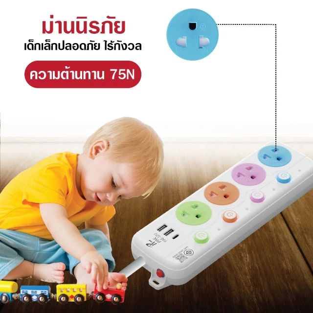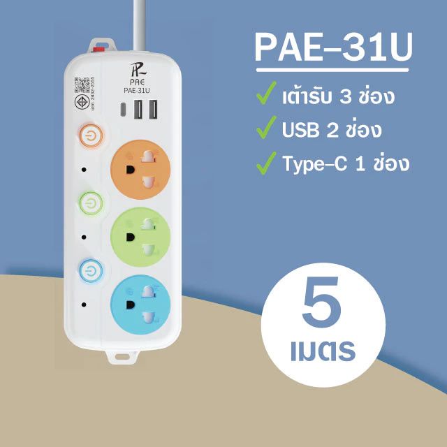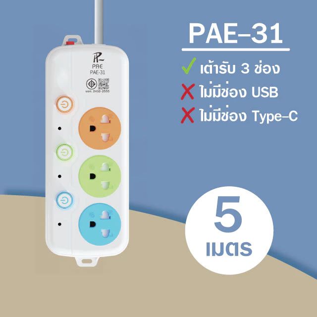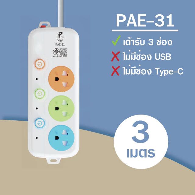 ปลั๊กพ่วง 3 ตา 2300W (3-4 ช่อง) มี USB/Type-C สายยาว 3-5ม.