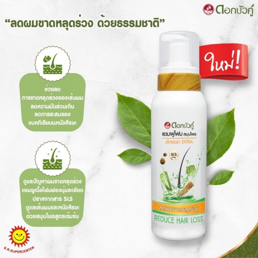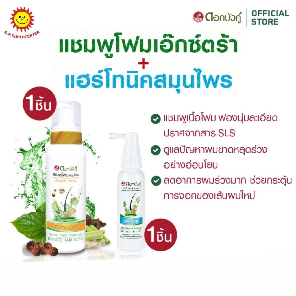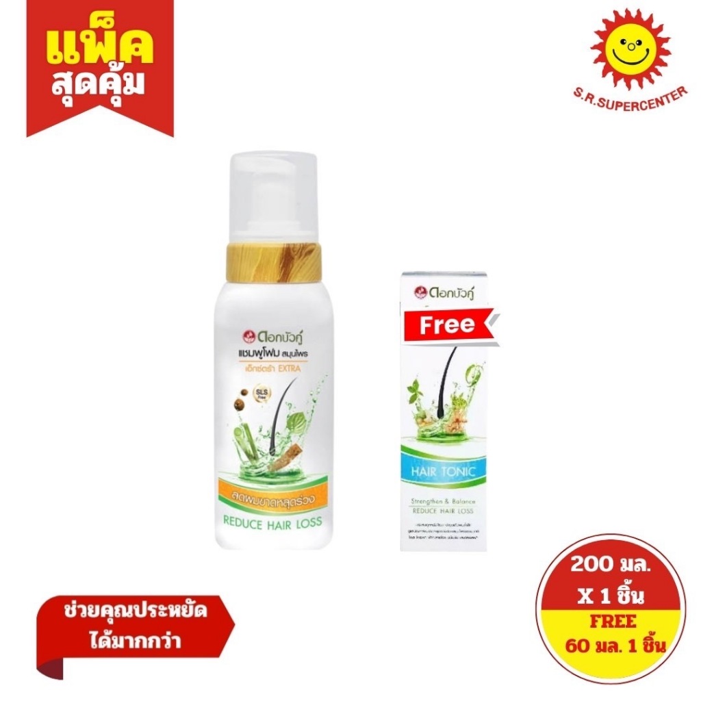 [ 1 แพ็ค ] Dok Bua Ku Extra Herbal Foam Shampoo แชมพูสมุนไพรเอ็กซ์ตร้า 200มล. แถม แฮร์โนทิคสมุนไพร 60 มล.