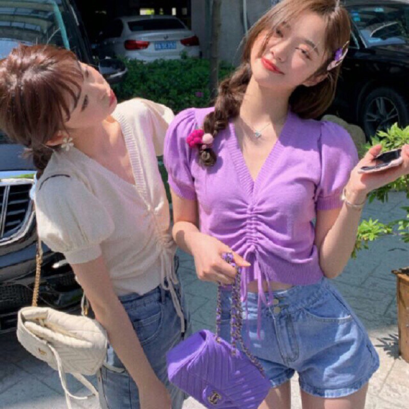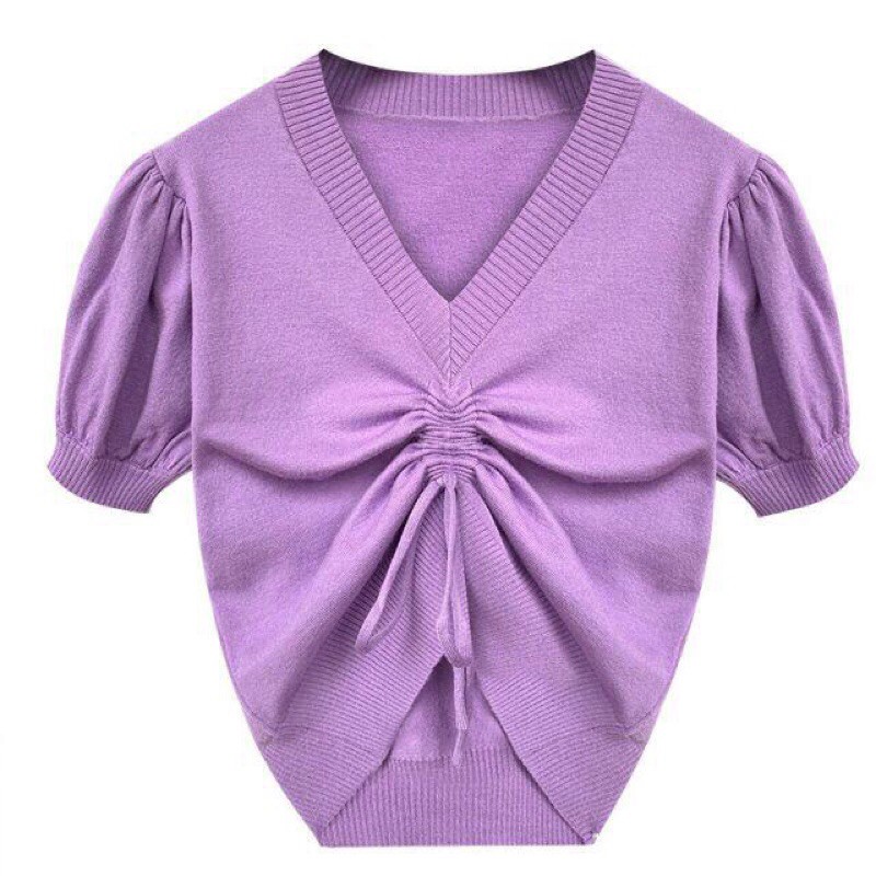 เสื้อไหมพรมรูดหน้าผ้าแน่นคอวีแขนตุ๊กตา