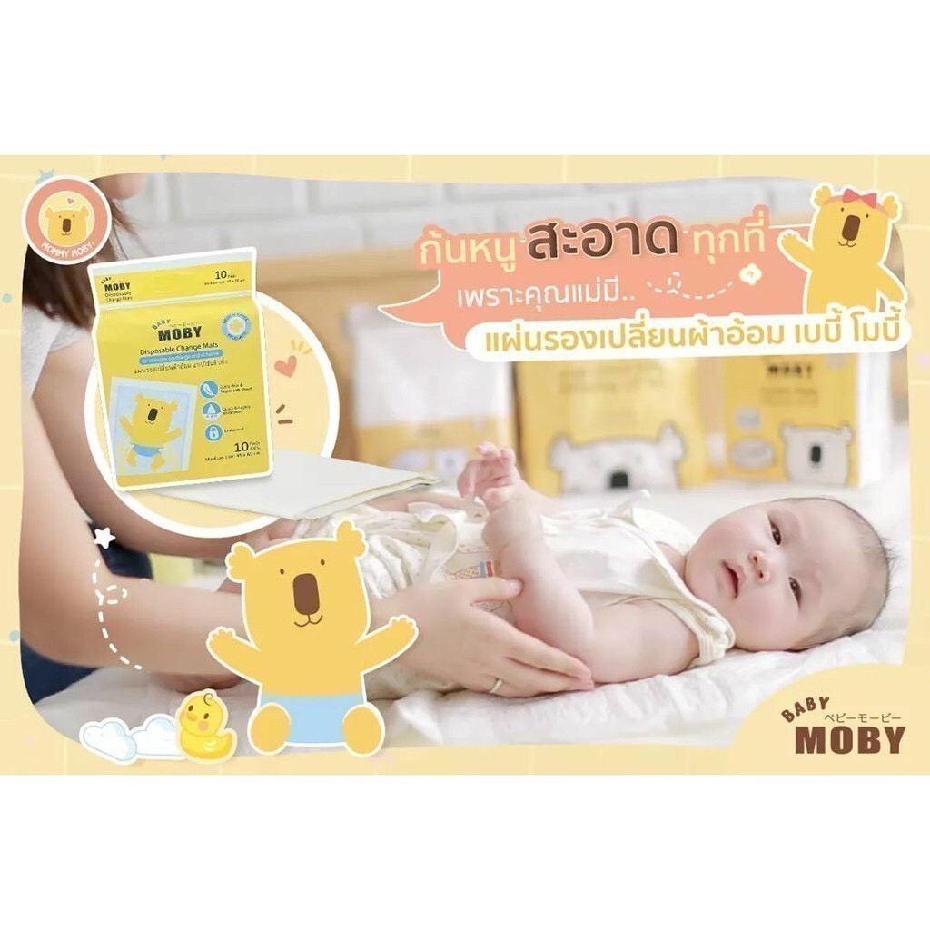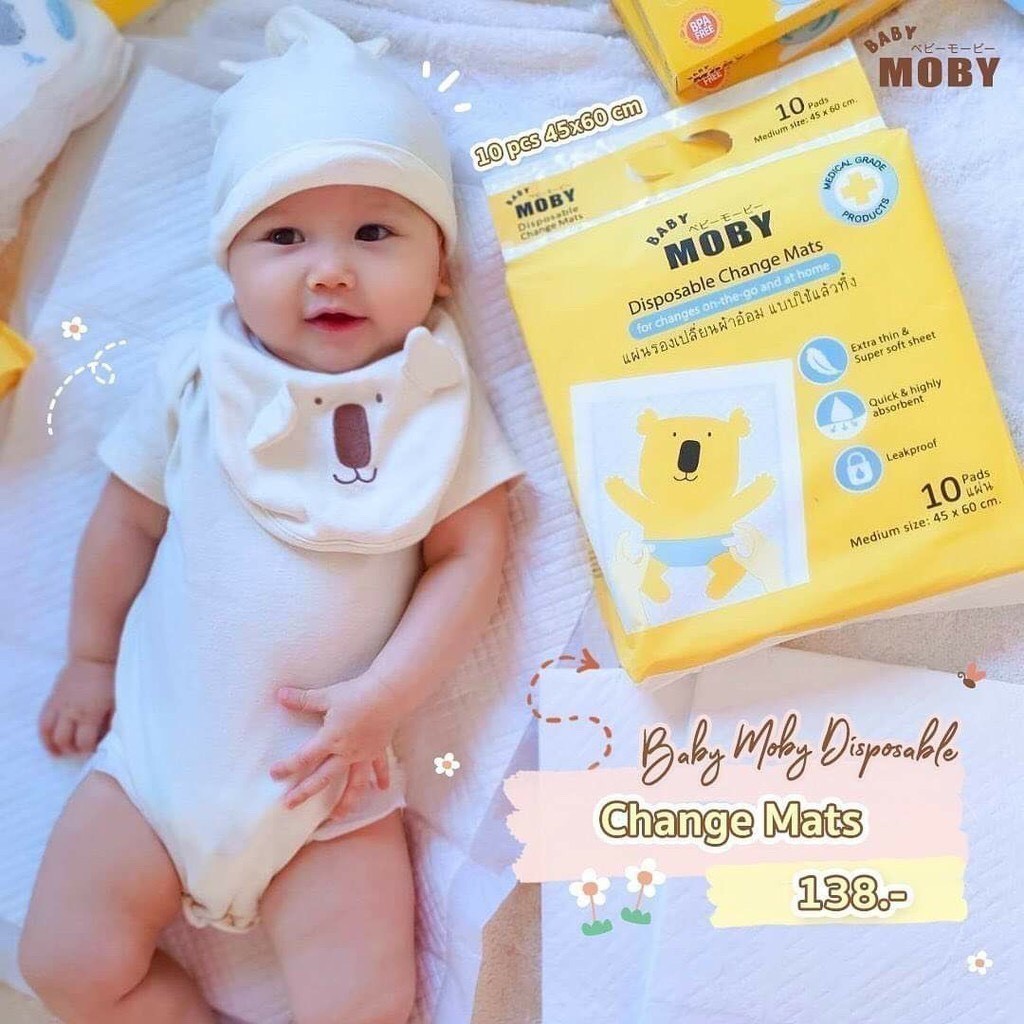 Moby แผ่นรองเปลี่ยนผ้าอ้อม แผ่นรองซับฉี่แบบใช้แล้วทิ้ง ซับน้ำได้เร็วมาก Disposable Pads ขนาด 45 x 60ซม. จำนวน 11 แผ่น