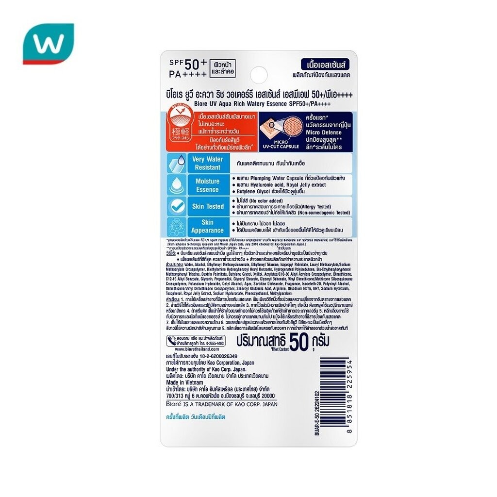Biore ครีมกันแดด Biore บีโอเร ยูวี อะควา ริช วอเตอร์รี เอสเซ็นส์ SPF50+PA++++ 50 กรัม
