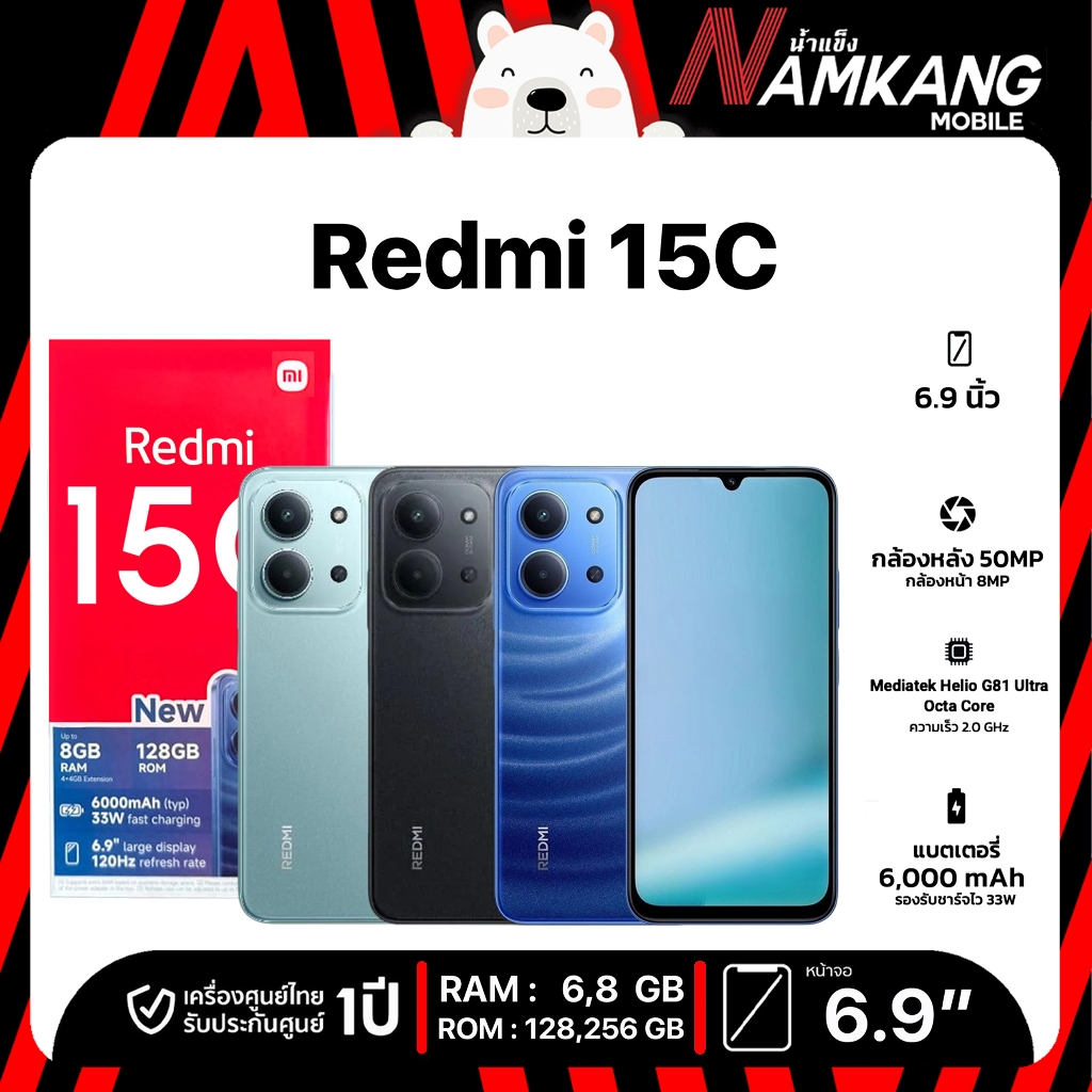 Redmi 15C 4G(6/128GB,8/256GB) หน้าจอ 6.9นิ้ว ความละเอียดHD+ แบตเตอรี่ 6000mAh ชาร์จไว 33W ชิปเซ็ต Helio G81-Ultra โทรศัพ