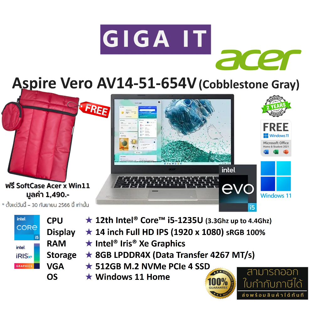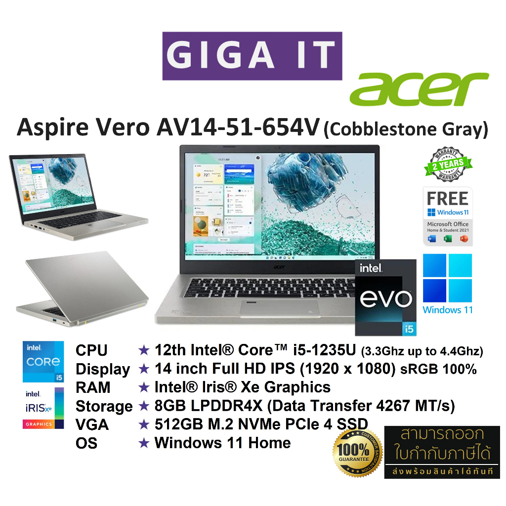 Acer Aspire Vero AV14-51-564V (14" FHD,i5-1235U, 8GB,Iris® Xe, 512GB M.2, Win11 + Office) Cobblestone Gray ประกัน 2 ปี