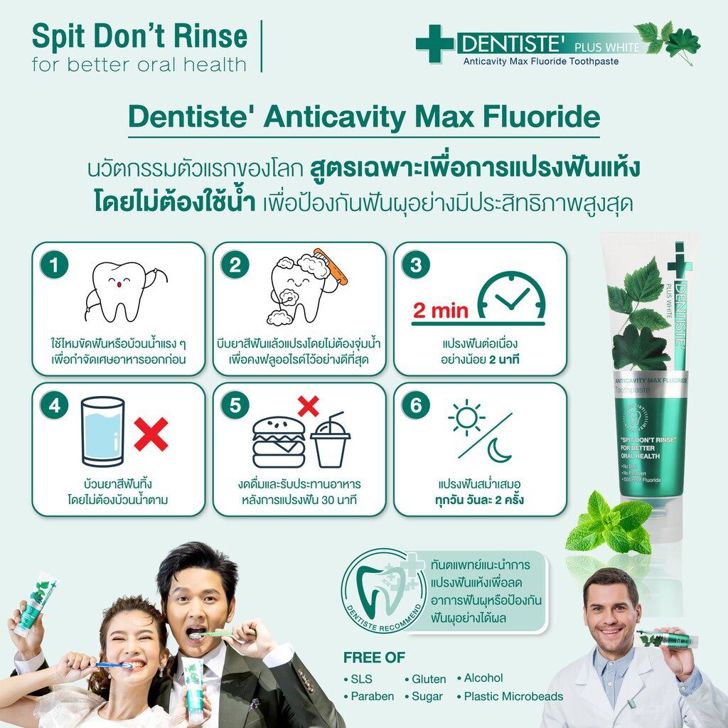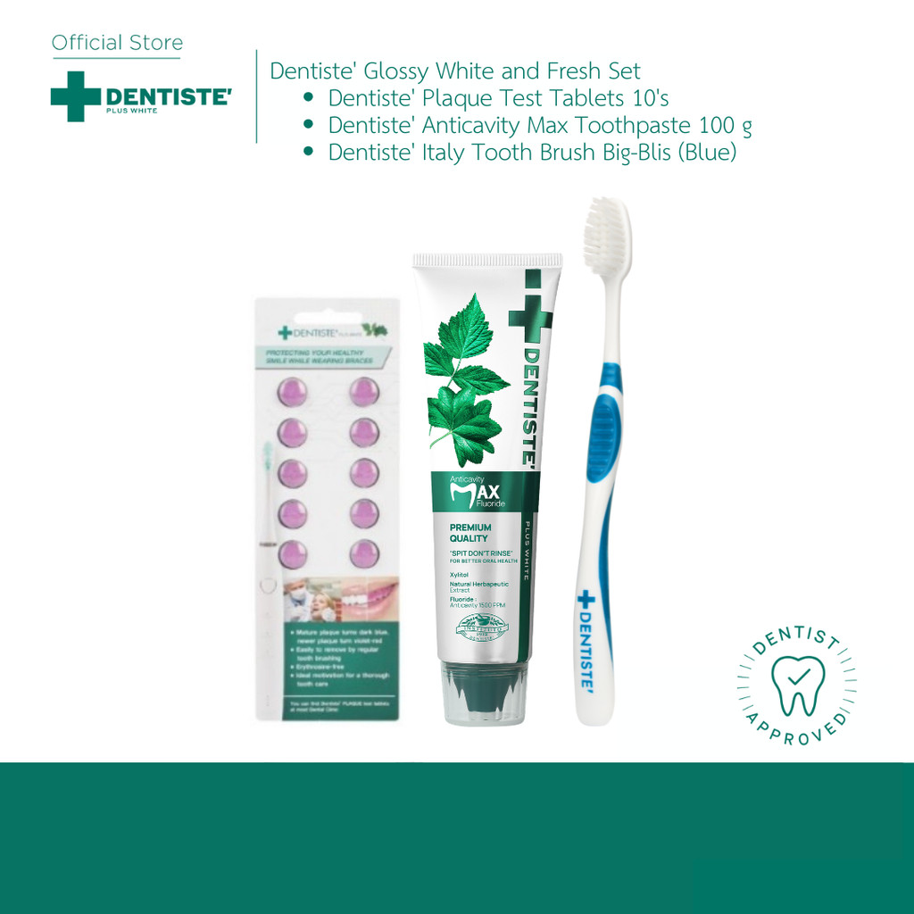 Dentiste' Glossy White and Fresh Set ชุดดูแลช่องปาก ทดสอบและขจัดคราบพลัค ยาสีฟันแปรงแห้ง ไม่ต้องใช้น้ำ ฟลูออไรด์