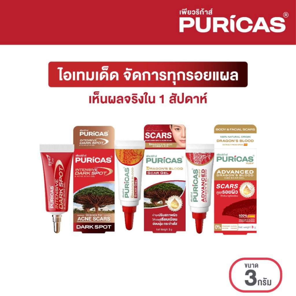 เซ็ตทดลอง จัดการทุกรอยแผล Puricas scar 3g.หรือ Intensive Dark Spot 3g. หรือ Advanced 3g.